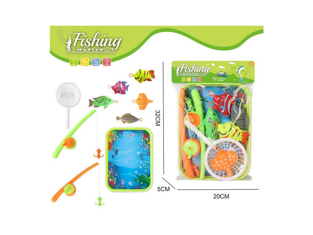 Chytanie rýb. Rozmery vodnej plochy 27x20x2 cm. Súčasťou 5 rýb, 2 udice, sito, vodná plocha.Dodatočné parametre