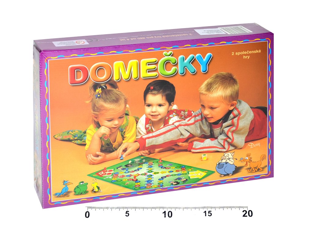 SPOLOČENSKÁ HRA DOMČEKY V KRABIČKE Sada obsahujúca dve obľúbené spoločenské hry pre deti, ktoré ešte nevedia počítať. Obe hry sú variáciou na známu a obľúbenú hru Človeče, nehnevaj sa. Obsah balenia: pestrofarebný herný plán figúrky farebnú kocku a kartičky Odporúčaný vek: od 3 rokovDodatočné parametre