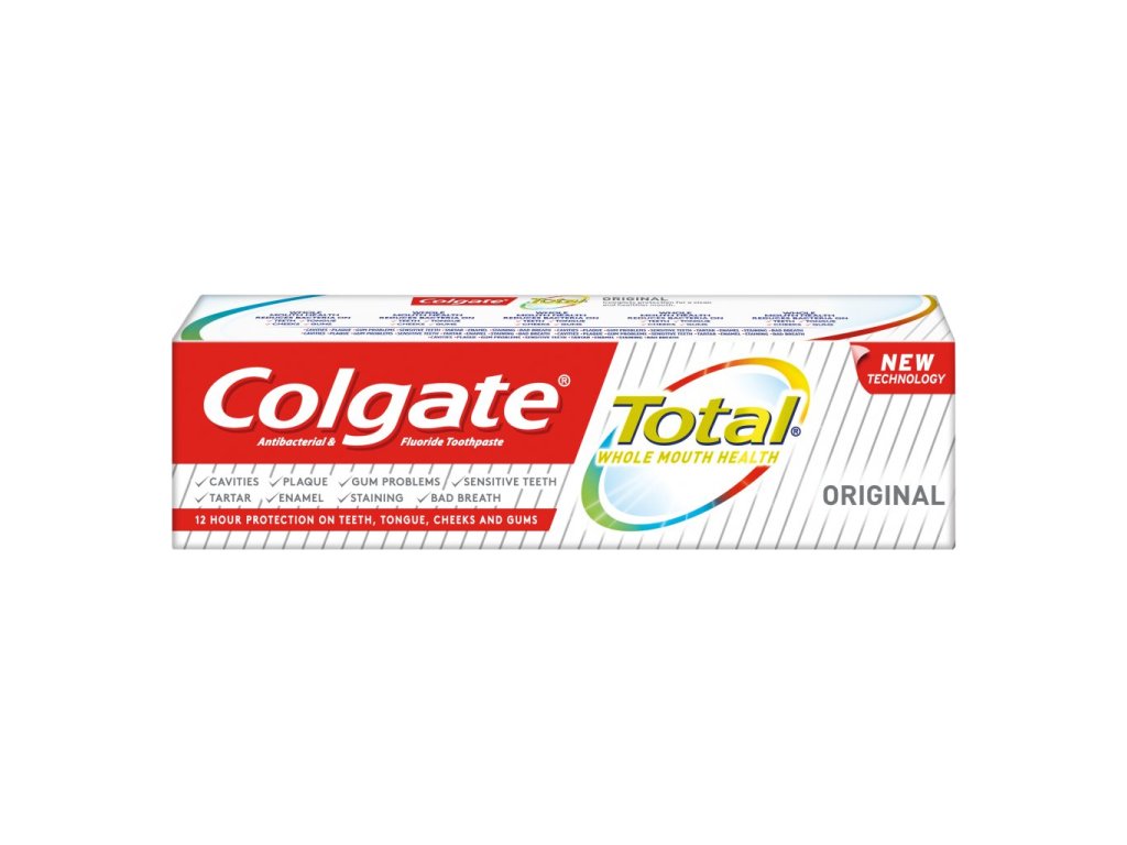 Colgate zubná pasta Total Original zaručuje celkovú ochranu pre vaše ústa. Pasta vám zaistí čistejšie a zdravšie ústa. Kompletnú antibakteriálnu ochranu a účinný boj proti chorobám zubov a ďasien vám pasta zaistí až na 12 hodín. Zubná pasta Colgate Total zároveň pomáha výrazne znižovať výskyt zápalu ďasien až o 88%. Úspešne tak chráni ústa pred negatívne pôsobiacimi látkami. Colgate Total 12. Vlastnosti Colgate Total Original zubná pasta: zamedzuje výskyt kazu zanecháva ústa čistejšie a zdravšie rieši problémy s citlivými ďasnami bojuje proti chorobám zubov a ďasien chráni ústa pred negatívne pôsobiacimi látkami