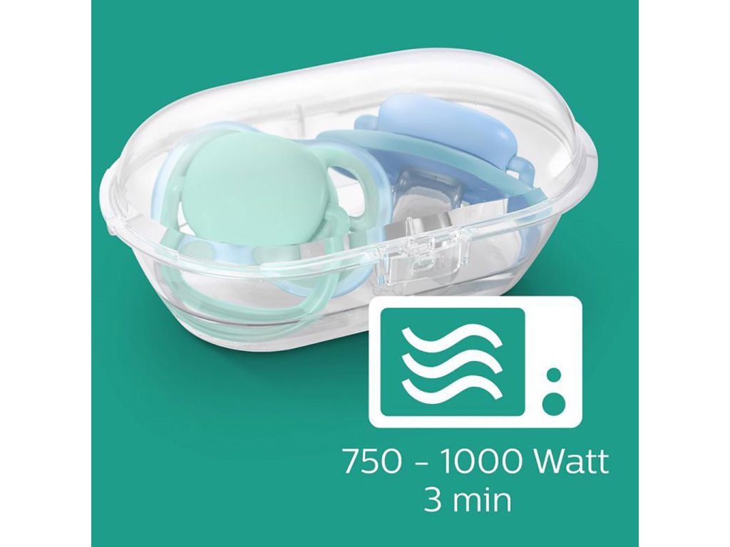 Sterilizačná/transportná krabička umožňuje sterilizovať cumlík v mikrovlnnej rúre a nosiť so sebou. Vždy používajte cumlík, ktorý svojou veľkosťou zodpovedá veku dieťaťa.