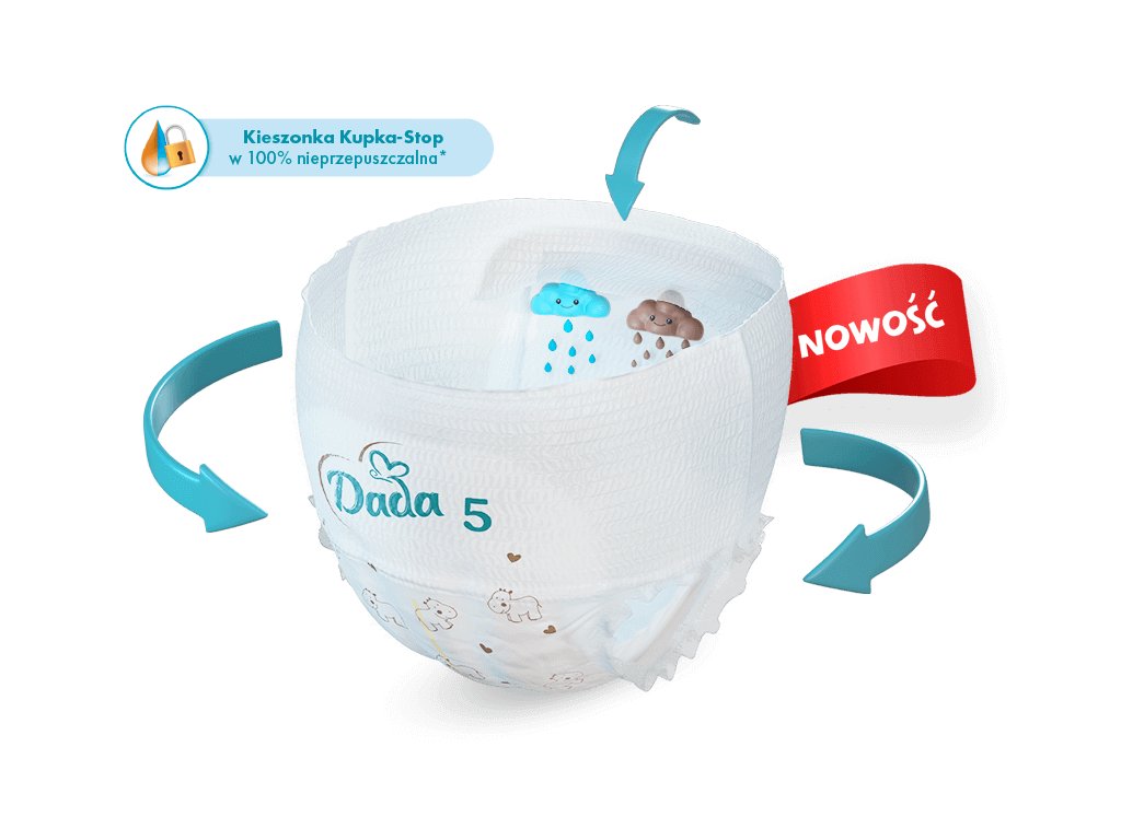 Vylepšené detské plienky Dada Extra Care poskytujú zvýšenú ochranu proti pretečeniu v každej polohe vďaka novému, 100% nepriepustnému* vrecku Kupka-Stop a 360° uchyteniu.