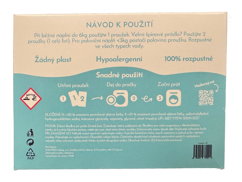 Delphino pracie papieriky predstavujú moderný a ekologický spôsob prania. Sú vhodné pre bielu i farebnú bielizeň , 100% rozpustné vo vode a neobsahujú žiadny zbytočný plast. Vďaka vysokej účinnosti a sviežej vôni si zamilujete nielen výsledok, ale aj samotný proces prania.