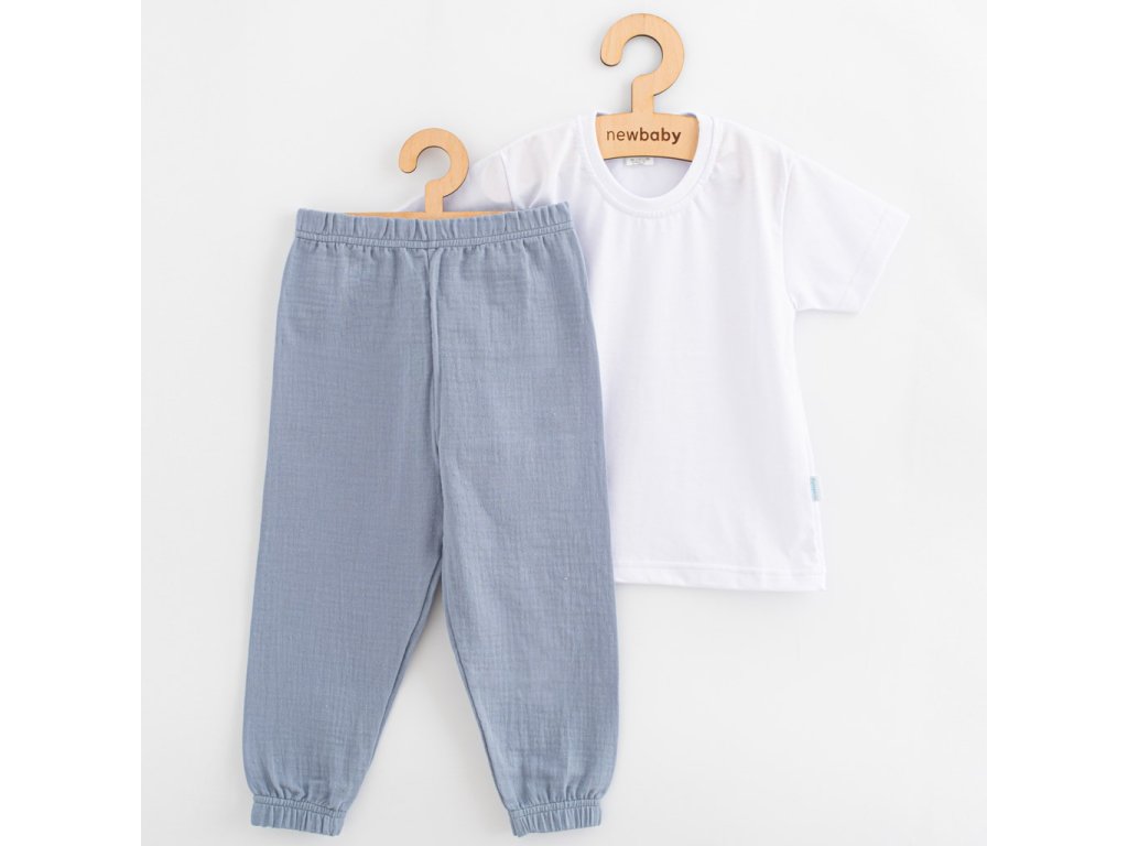Štýlová a praktická 2-dielna detská súprava českej značky New Baby Kindergarten. Súpravička sa skladá z bavlneného trička s krátkym rukávom a mušelínových nohavíc. Veľmi praktický set pre deti aj do škôlky. Bavlnené tričko je veľmi pohodlné už len tým, že je vyrobené z kvalitnej bavlny, bez zapínania, s jemným lemom okolo krčku. Lem nesmie tlačiť, obopínať a tričko sa musí ľahko obliekať cez hlavičku. Mušelínové detské jednofarebné nohavice s moderným dizajnom sú ušité z kvalitného mušelínu. Pre veľmi ľahké obliekanie majú praktický voľný strih, v páse a na nohavičkách je gumička, ktorá netlačí. Nohavice sú veľmi vhodné aj na bežné detské činnosti. Zloženie: 100% bavlna. OEKO-TEX STANDARD 100. Mušelín je jedna z najčistejších, najjednoduchších a najjemnejších tkanín na svete. Je to tkaný priedušný materiál, ktorý si zamilovali deti aj rodičia po celom svete. Mušelín je veľmi odolný a to tak, že bez problémov zvláda opakované pranie. Rozmerová tabuľka-posledná foto.Dodatočné parametre