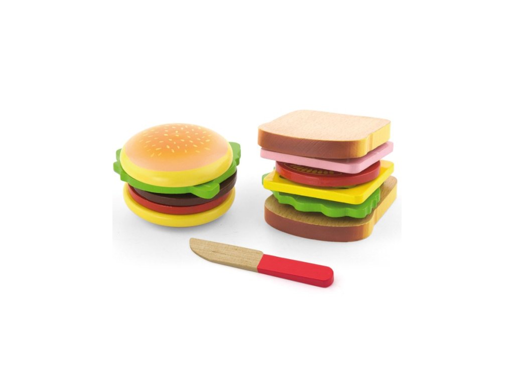 Detská drevená hračka Viga Hamburger a Sendvič je kreatívny set pre malých kuchárov a kuchárky, kedy príprava raňajok už nebude nudná. Všetky výrobky sú spojené suchým zipsom, ktorý poskytuje nekonečnú zábavu. Našou prioritou je bezpečnosť a kvalita našich výrobkov, a preto farby použité na hračkách nie sú toxické a spĺňajú bezpečnostné štandardy (EN71 a ASTM). Určené pre deti od 18 mesiacov. Súprava obsahuje:- nôž