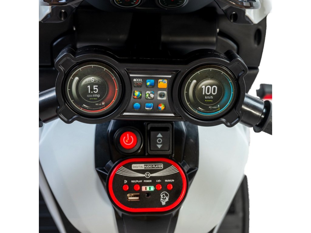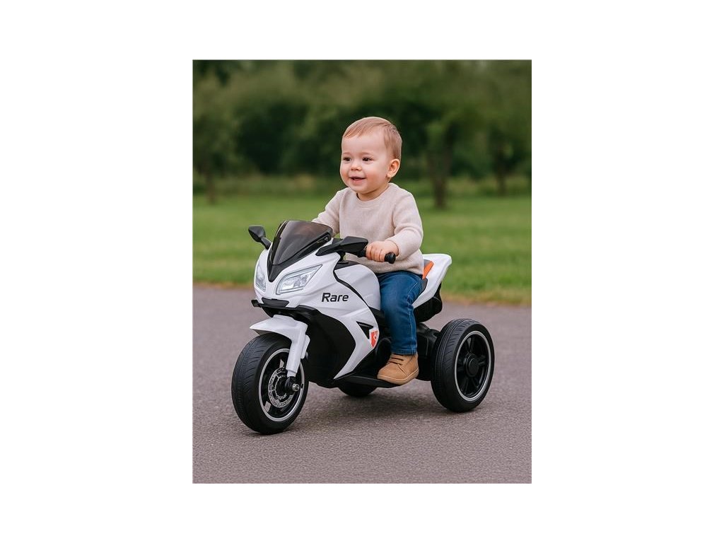 Detská elektrická motorka Rare Baby Mix je vybavená batériou 6V7AH a dvoma motormi s výkonom 380. Disponuje funkciou jednoduchého štartu na jedno tlačidlo, ktorá umožňuje jazdu vpred aj vzad. Motorka je vybavená hudbou, pesničkami pre deti, kartou na čítanie dát pre rané vzdelávanie, tromi kolesami a LED svetlometmi. Komfort zaisťuje kožené sedadlo.