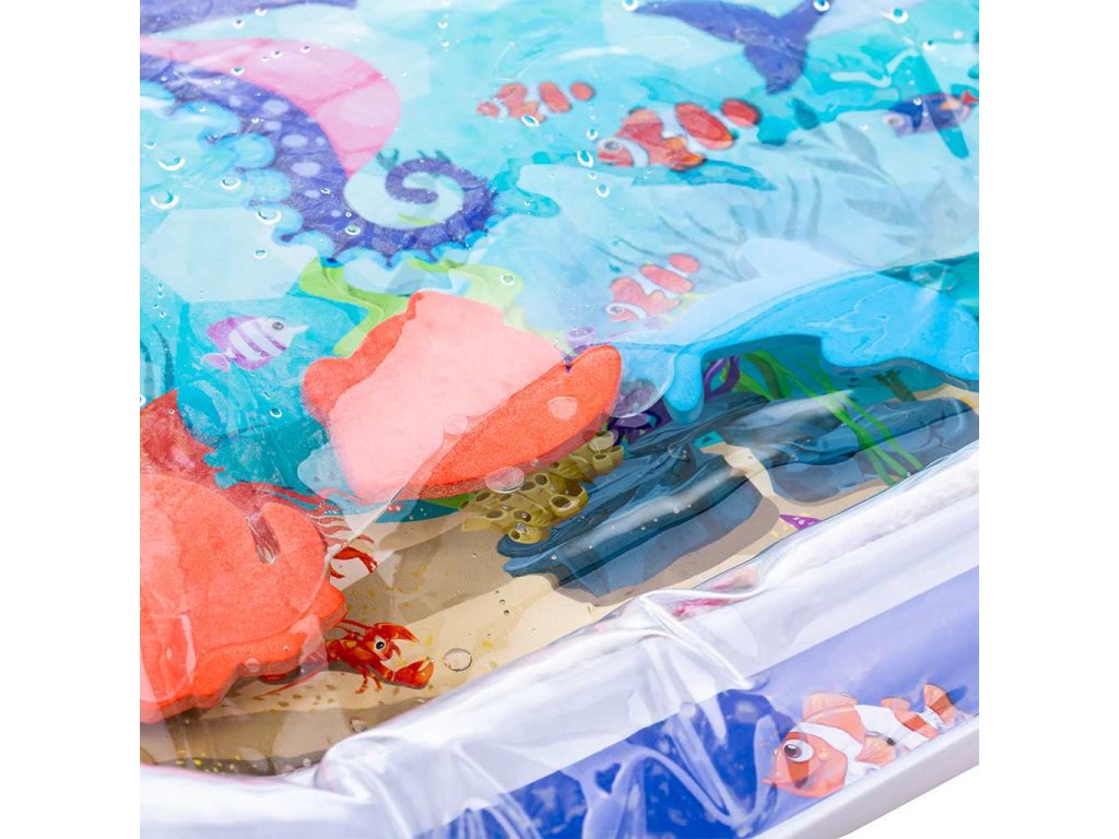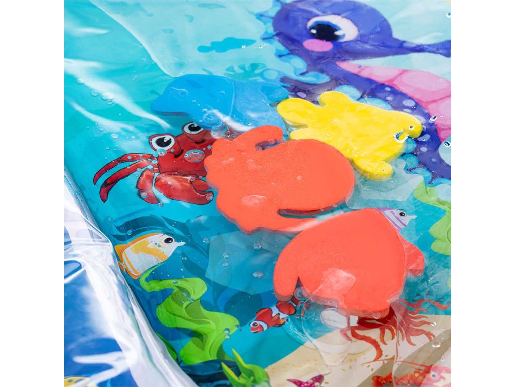 Interaktívna podložka vyrobená z kvalitného materiálu, ktorý zaručuje mimoriadnu odolnosť. Okraj podložky nafúknite a do stredu napustite vodu. Vnútri je 5 farebných vodných živočíchov, ktorí sa pod váhou dieťaťa budú pohybovať v priestore naplnenom vodou. Počas hrania na podložke sa dieťa učí používať rôzne svalové partie na udržanie rovnováhy a samostatnému pohybu. Zvyšuje tým silu a vytrvalosť nôh, paží, brucha a chrbta. Potom čo si dohráte, vylejte vodu a vypustite vzduch.