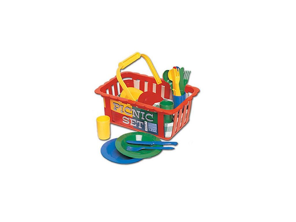 Detský plastový set na hranie - košík s riadom. Súprava obsahuje - štyri tanieriky, štyri poháriky, štyri lyžice, vidličky a nože. Rozmer košíka cca 22x15x7 cm. Farebné prevedenie sa líši podľa aktuálnej ponuky, dopíšte preto prosím do poznámky, akú farbu preferujete. Vhodné pre deti od 3 rokov.