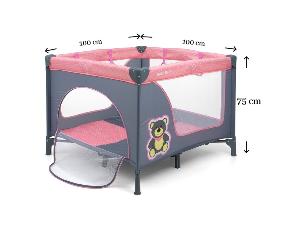 Detská skladacia ohrádka Milly Mally Fun. Ohrádka je ideálnou kombináciou postieľky a miesta na hranie. Jednoduché a rýchle skladanie ako pri cestovnej postieľke. Priehľadná sieťka na bočných stranách umožňuje dieťaťu sledovať okolie a krásne a farebné vzory dieťa zaujmú. Jeden bok má otváracie dvierka na zips. Ohrádka má mäkký farebný matrac. Súčasťou je aj taška na prenášanie.