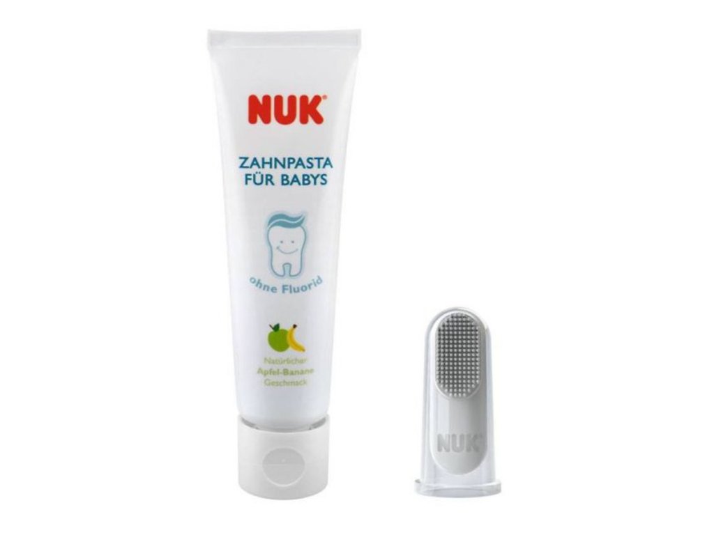 Detská zubná pasta a náprstok NUK. Na čistenie prvých zubov a ústnej dutiny, na jemnú masáž ďasien. Pre deti od 3 mesiacov. Charakteristika: Zubná pasta:- bez fluoridu