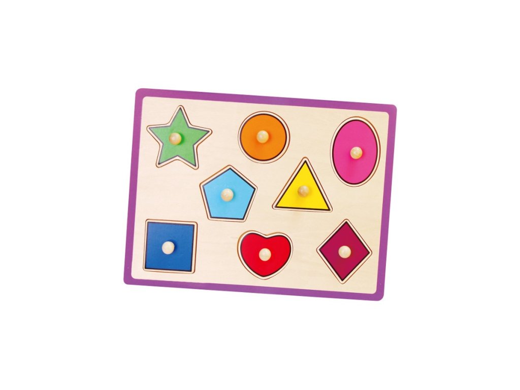 Detské drevené puzzle s úchytmi Viga Geometrické tvary. Puzzle na drevenom podklade je tvorené dielikmi s obrázkami. Deťom sa vďaka úchytom puzzle lepšie držia v prstoch a ľahšie sa vkladajú do určených miest. Balenie obsahuje 8 dielikov. Určené pre deti od 18 mesiacov. Prvé puzzle pre Vaše malé deti, má veľmi výrazné farby, jednoduchý design a veľké dieliky. Našou prioritou je bezpečnosť a kvalita našich výrobkov, a preto farby použité na hračkách nie sú toxické a spĺňajú bezpečnostné štandardy (EN71 a ASTM). Rozmer cca: 30x23 cm.Dodatočné parametre