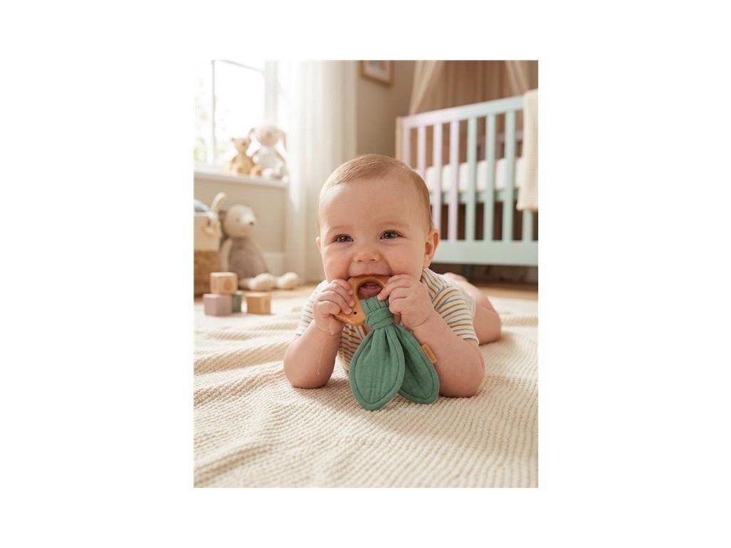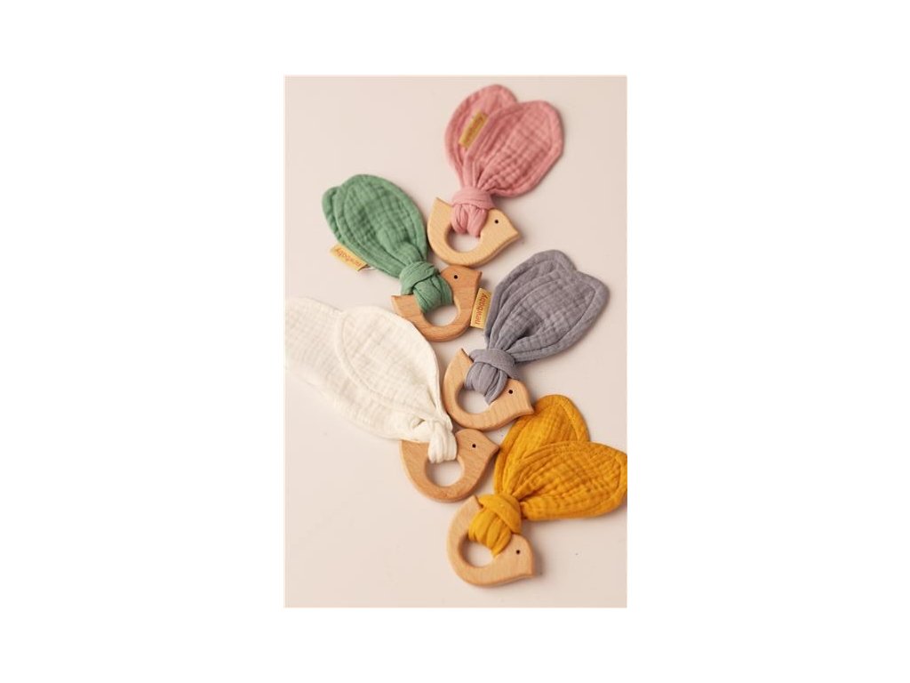 Hryzátko s mušelínovou plienkou je ideálna sada, keď sa dieťaťu prerezávajú zúbky. Hryzátko je vyrobené z bukového dreva šetrného k stredu a mäkkej mušelínovej látky. Úplne bezpečné pre deti prináša upokojujúcu úľavu pri prerezávaní zúbkov. Hryzátko je možné použiť aj ako hračku pre bábätká. Hryzátko sa dokonale hodí k našim ďalším mušelínovým výrobkom a vytvára tak krásnu sadu, ktorú je možné darovať na detskú oslavu.