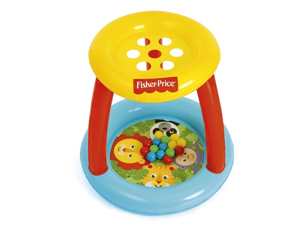 Nafukovacie hracie centrum Fisher Price s interaktívnymi otvormi s loptičkami pre rozvoj motoriky. Rozvíja jemnú motoriku, predstavivosť a kreativitu. Bezpečnostné ventily pre ľahké nafukovanie a vyfukovanie. 1 x hracie centrum, 15 x farebné loptičky, 1 x odolná záplata. Rozmery: 89 x 89 x 84 cmDodatočné parametre