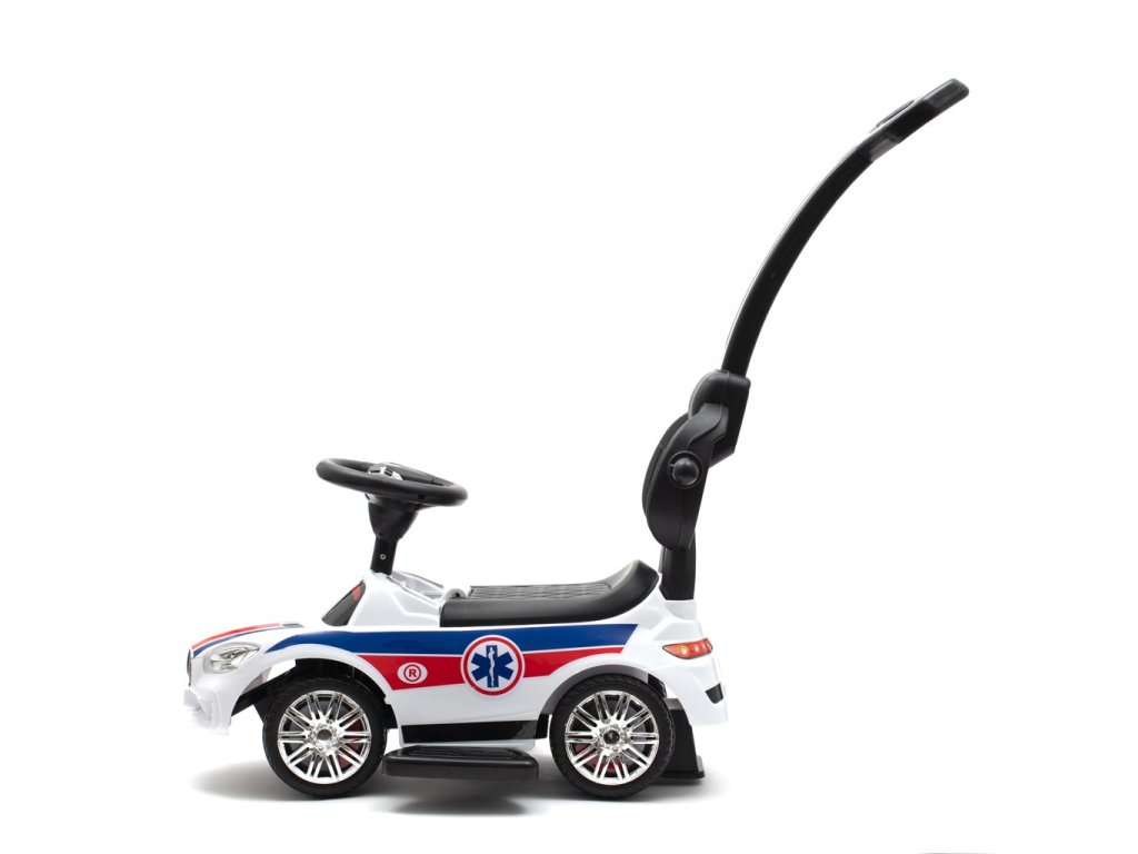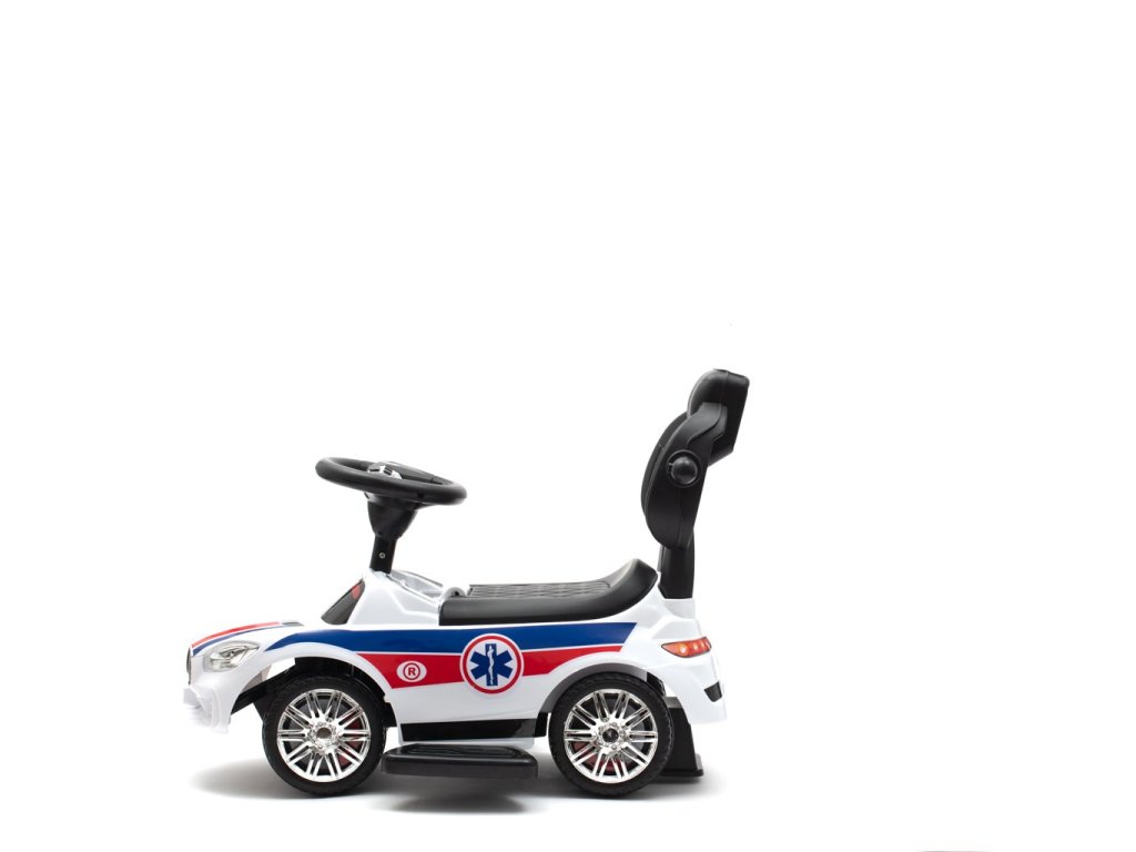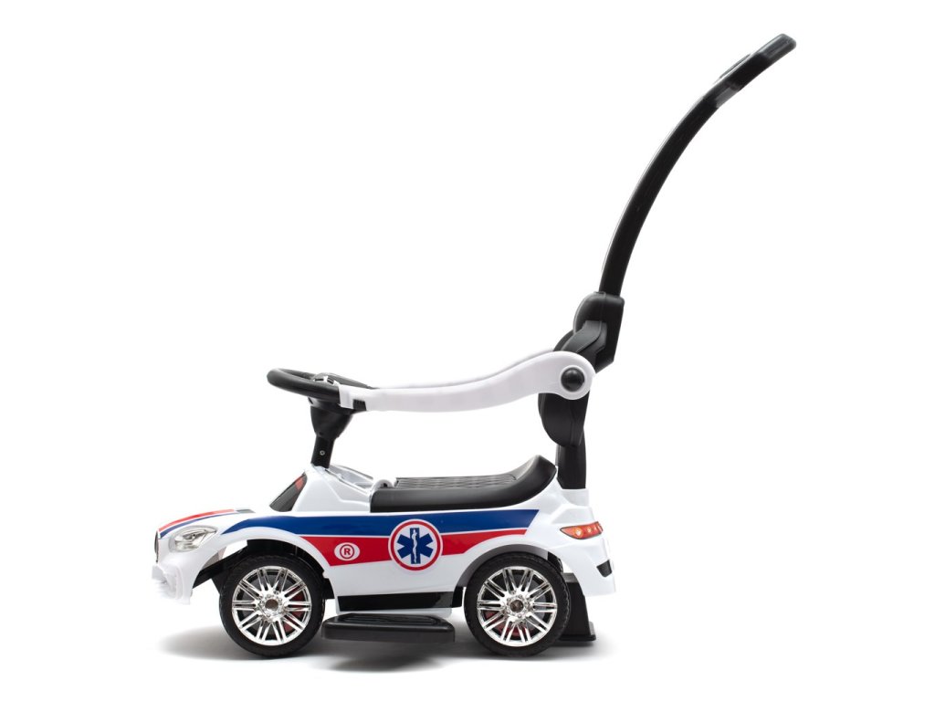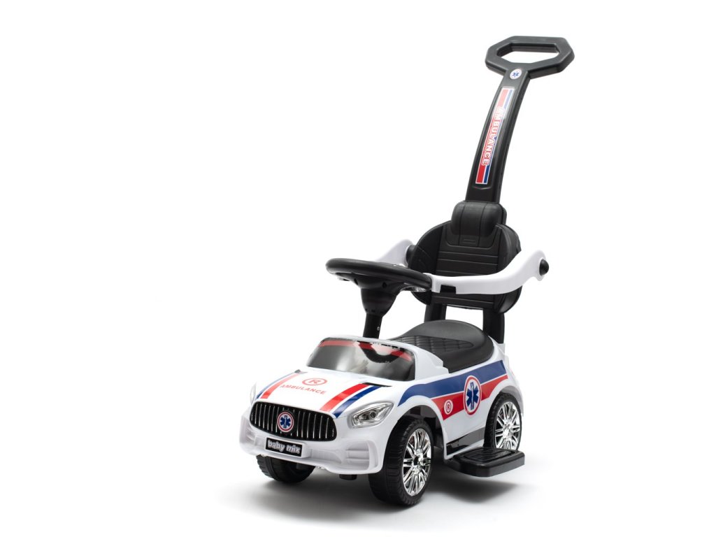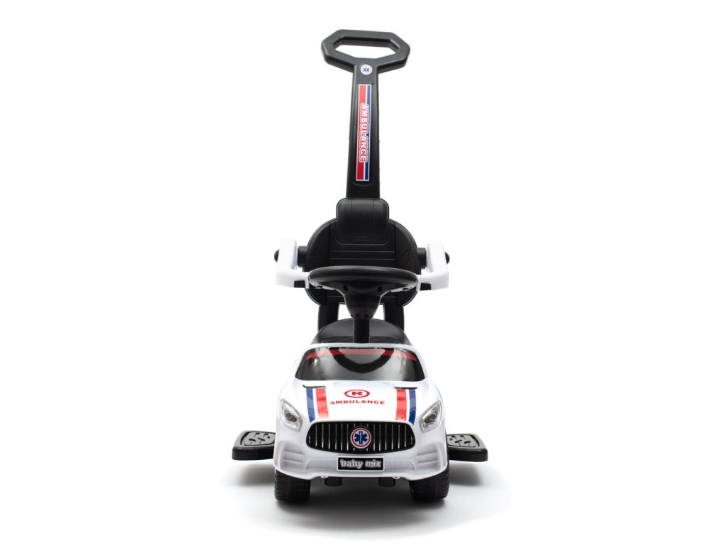 Autíčko jazdítko Baby Mix AMBULANCE je skutočnou lahôdkou pre všetkých záchranárov. Dokonalé spracovanie a detaily ako kolesá, svetlá alebo tvar karosérie, priťahujú pozornosť všetkých a rýchlo sa stanú obľúbenou hračkou doma aj na prechádzke. Je vyrobené z kvalitných materiálov a je vybavené zvukovým panelom. Jazdítko pomáha rozvíjať motorické schopnosti dieťaťa a zaručuje množstvo zábavy a radosti. Vďaka špeciálnej blokáde v zadnej časti je váš pretekár chránený proti prevráteniu. Vodiacu tyč, opierky na ruky a podnožky je možné zložiť, a tým dieťa využije autíčko ako klasické odrážadlo.