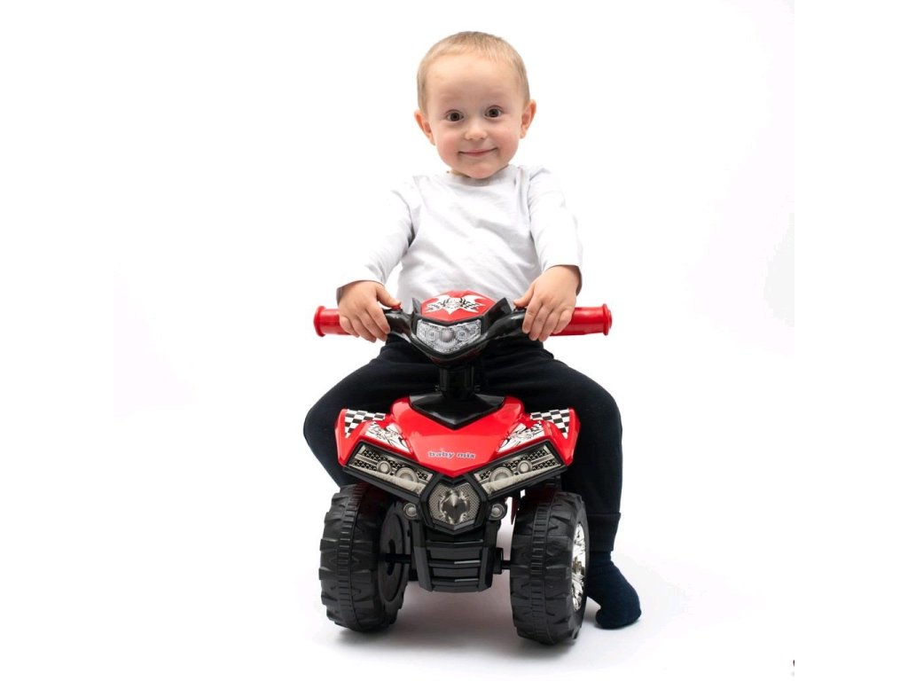Skvelá Štvorkolka Baby Mix s tromi melódiami, klaksónom a blikajúcimi svetielkami na riadidlách. Štvorkolka má veselé farby a je vyrobená z kvalitného a pevného plastového materiálu. Odrážadlo pomáha rozvíjať motorické schopnosti dieťaťa a zaručí mu veľa zábavy a zábavy. Je určené ako pre najmenšie deti, ktoré už vedia sedieť, tak aj pre deti, ktoré sa už naučili chodiť. So štvorkolkou si Vaše dieťa užije veľa zábavy a zábavy. Naša super štvorkolka skvele vyzerá, má komfortné široké sedadlo, široké riadidlá a veľké plastové kolesá. Na riadidlách má efektnú húkačku a tlačidlo s tromi uloženými melódiami. Batérie nie sú súčasťou balenia (2x AA 1.5V). Farby samolepiek sa môžu líšiť podľa aktuálnej ponuky.