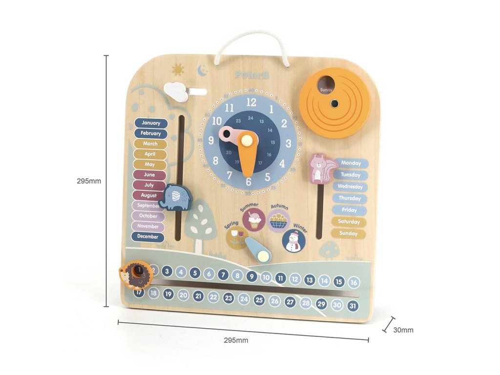 Hračka v tvare dosky obsahuje ciferník s pohyblivými ručičkami a posuvníkmi počasia a kalendára, ktoré učia počasie, dennú dobu, dni a delenie týždňa, mesiace, ročné obdobia. Tabuľa je vybavená držadlom na prenášanie.