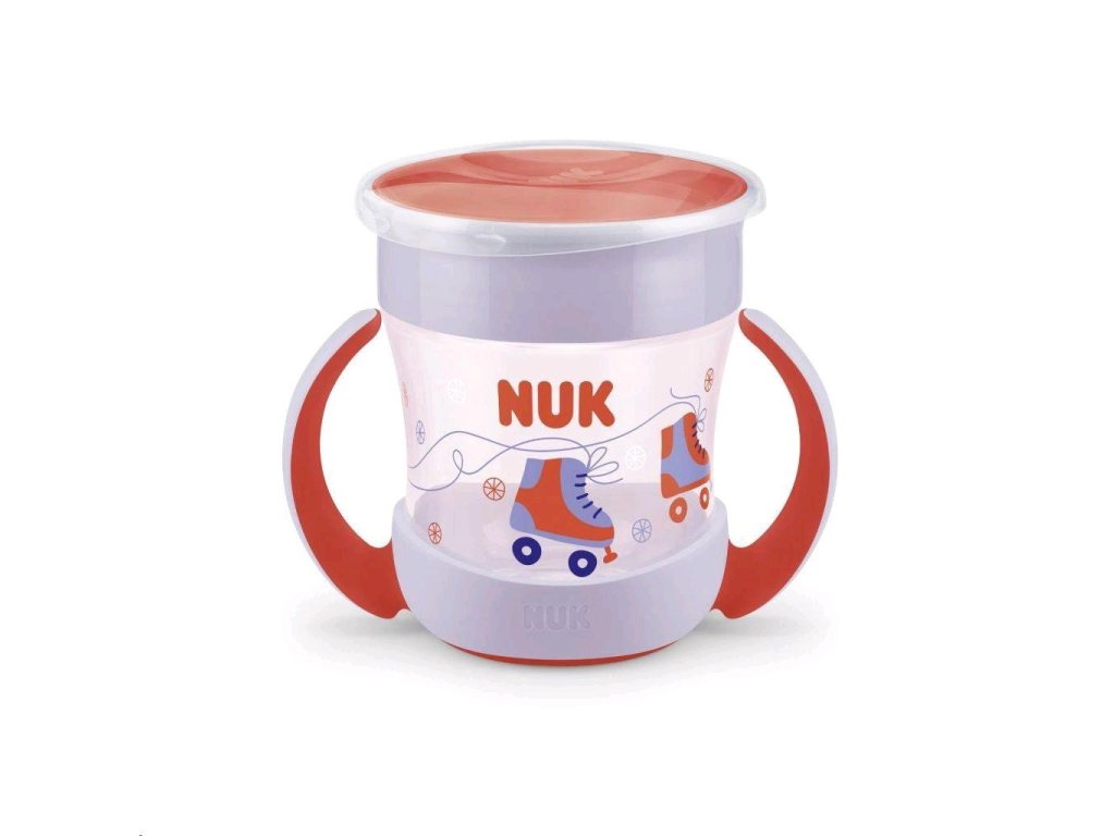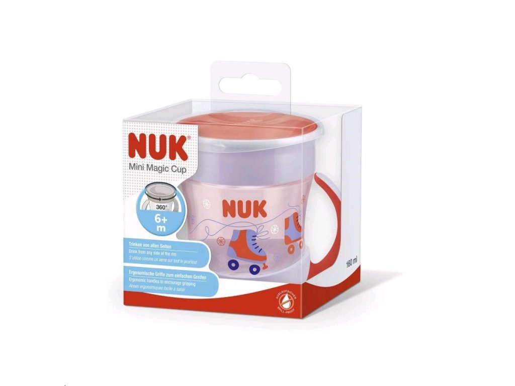 Detský hrnček MIni Magic NUK 360 ° s viečkom. Revolučný uzáver umožňuje piť bez náustku či slamky z každej strany, vďaka čomu sa dieťa učí samo piť ako z normálneho hrnčeka. Neobsahuje BPA. Charakteristika:- pitie je možné zo všetkých strán vďaka 360 ° pitnému okraju