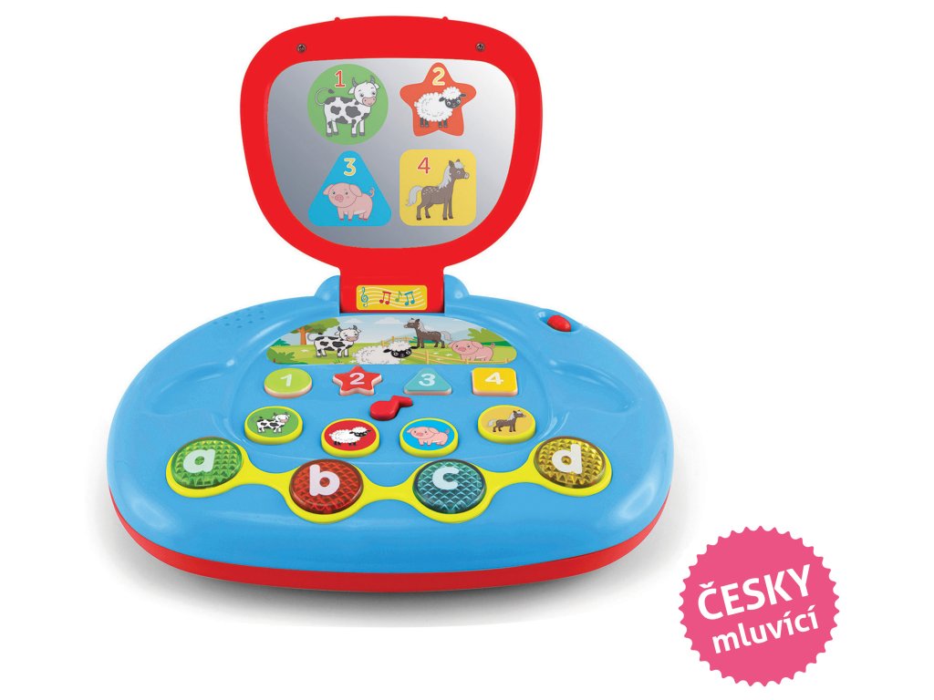 Detský počítač - hovorí po česky. Rozmery 20x16 cm. Svetelné a zvukové efekty. 3xAA batérie súčasťou. Premietanie (displej) v zrkadle. Prepínač - vypnuté, nižšia, vyššia hlasitosť. Výučba čísel, farieb, písmen, tvarov, zvuky zvieratiek, melódie (nota).Dodatočné parametre
