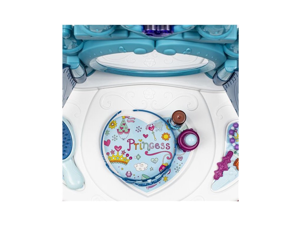 Detský toaletný stolček s taburetom obsahuje sadu makiet kozmetiky, ako je fén, hrebeň, laky na nechty, prstene, kvety do vlasov, náramky, náhrdelník a nálepky. Súčasťou sady je tiež umelý prútik, po stlačení prútika sa otvorí zrkadlo. Toaletný stolček je vybavený zásuvkou na uchovávanie drobností. Sada vyžaduje 5AA batérií, ktoré nie sú súčasťou balenia.