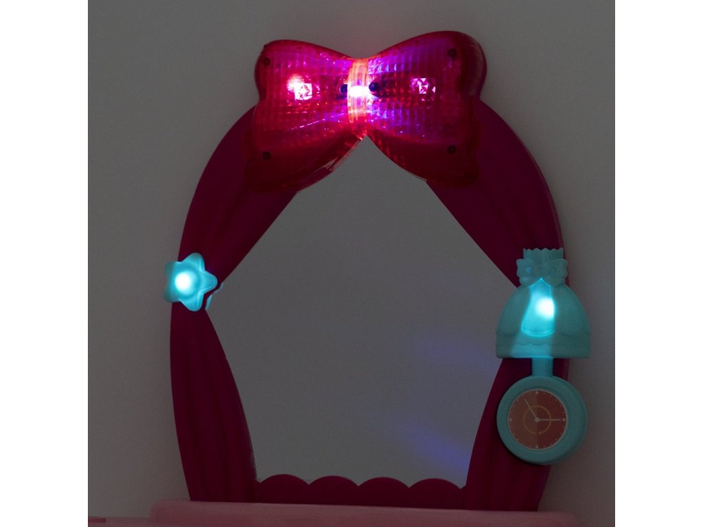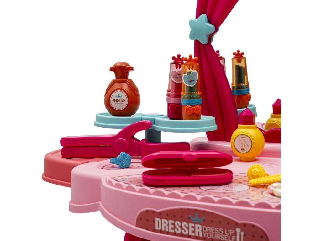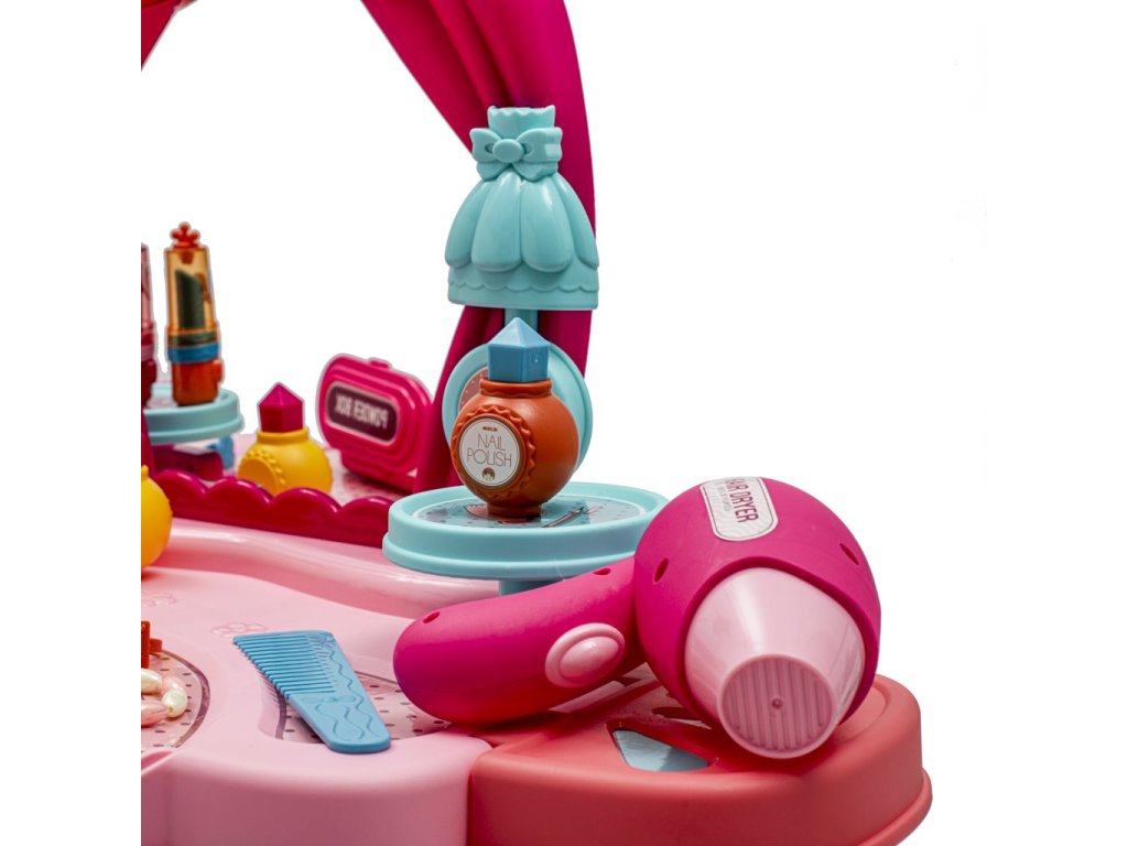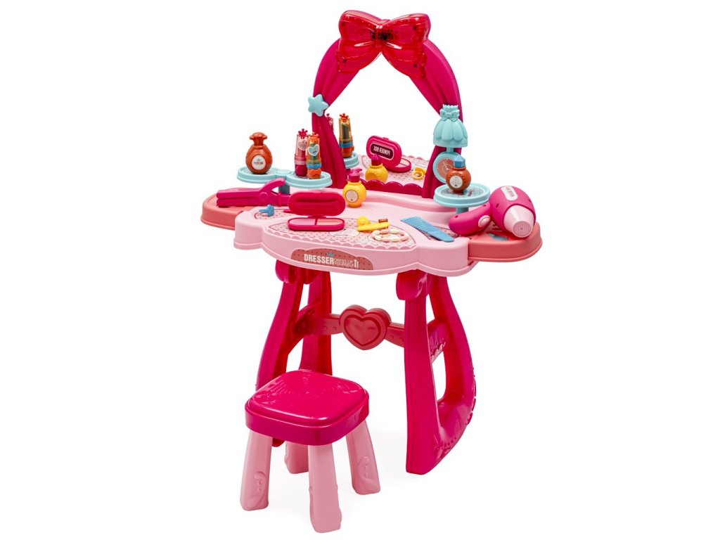 Detský kozmetický stolík je určený pre deti od 3 rokov. Toaletný stolček má zvukové efekty, dodáva sa s maketami kozmetiky a jeho súčasťou je aj stolička.