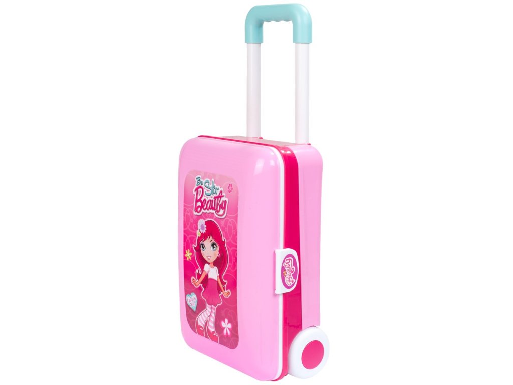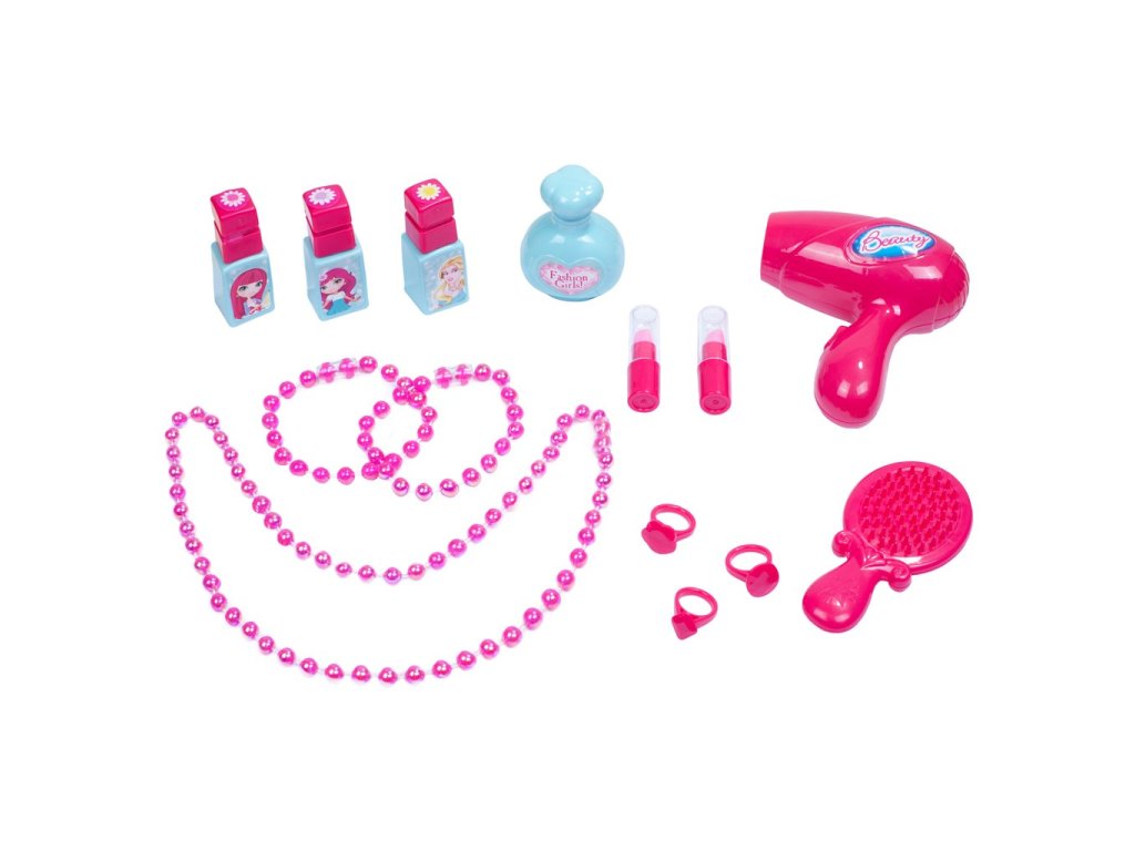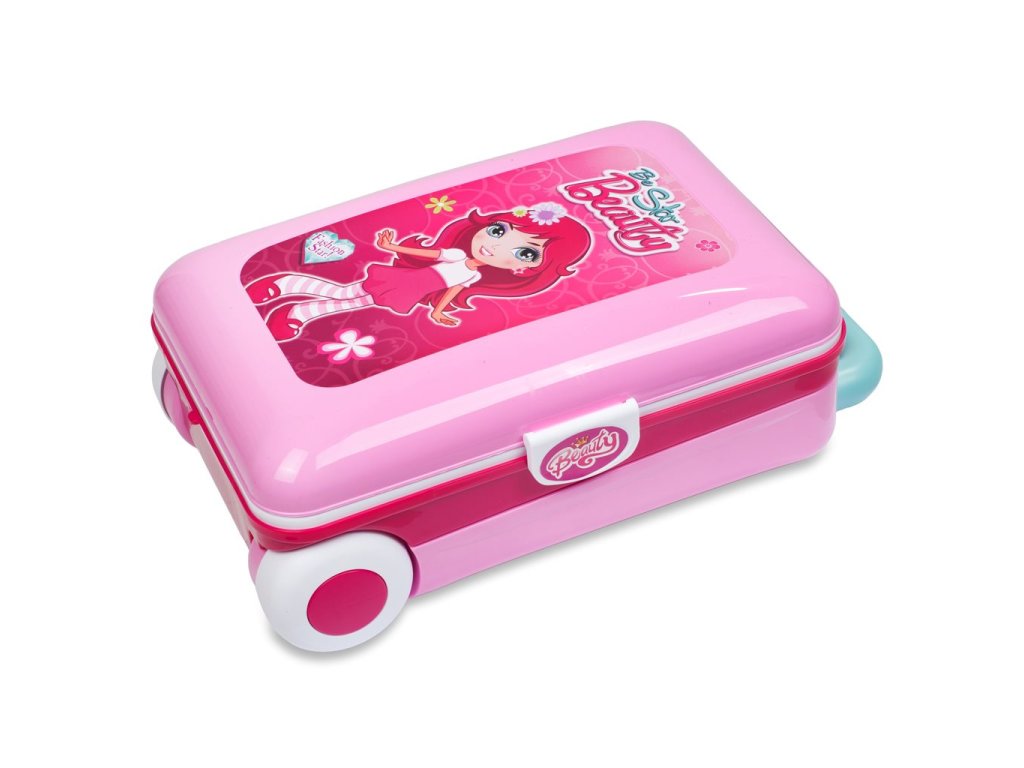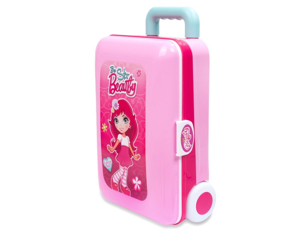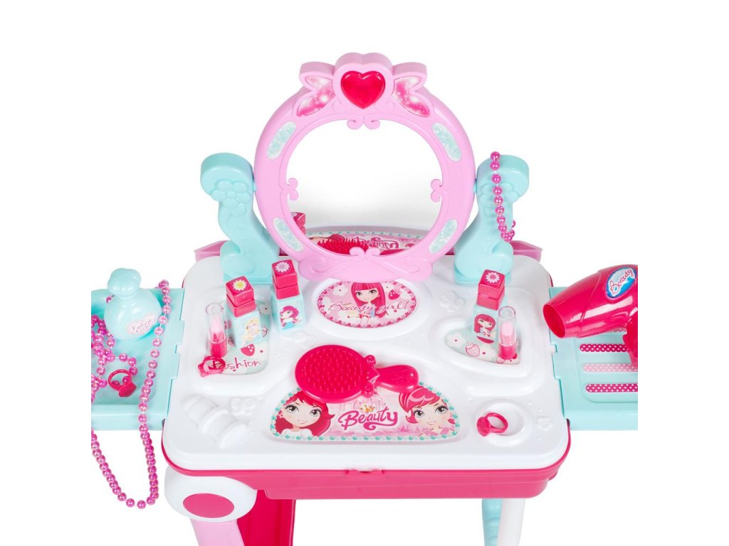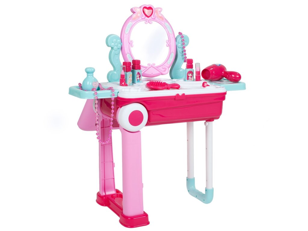 Krásny detský toaletný stolík v kufríku Baby Mix ukrýva v sebe skutočný poklad pre každú malú princeznú. Po otvorení zmeníte kufrík na naozajstný toaletný stolík obsahujúci zrkadlo so svetielkom v tvare srdiečka, ktoré po stlačení vydáva kúzelný zvuk. 3 batérie typu AAA nie sú súčasťou dodávky. V stolčeku nájde ďalej vaša princezná fén, dva náramky, náhrdelník, tri prstienky, tri fľaštičky s lakom na nechty, dva balzamy na pery, hrebeň na vlasy a parfum. Kufrík je vybavený kolieskami a teleskopickou tyčou, ktoré každá malá princezná ocení aj na cestách. Náš toaletný stolček je skvelým darčekom pre každé malé dievčatko. Sada neobsahuje skutočnú kozmetiku, celá je vyrobená z kvalitného plastu, preto je úplne bezpečná. Je určená pre deti od 3 rokov.Rozmery stolčeka: 60 x 53 x 24,5 cm