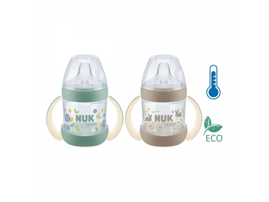 Dojčenská fľaša na učenie NUK for Nature 150 ml s kontrolou teploty. Zabudovaný indikátor kontroly teploty zmení farbu, pokiaľ je obsah fľaštičky príliš horúci. Modrá farba indikátora sa zmení na bielu. Fľaštička bábätkám uľahčuje prechod od dojčenia alebo kŕmenia k samostatnému pitiu. Dojčenská fľaša má extra široké a mäkké silikónové náustok a poskytuje vášmu dieťatku prirodzený pocit pitia hneď od začiatku. Je ergonomicky tvarovaná, má protišmykové dno pre stabilitu fľaštičky a protišmykové držadlá, takže si dieťa môže fľašu držať samo napríklad aj pri jazde v kočíku. Inovatívny antikolikový ventil navyše umožňuje neprerušované pitie pripomínajúce dojčenie a zabraňuje prehĺtaniu vzduchu. Nekvapkajúce náustok zaručuje prepravu bez vyliatia, takže sa fľaštička na učenie môže stať vaším verným spoločníkom na cestách. Výhodou tejto super fľaštičky je, že sa ľahko rozmontujete a čistí. Vyrobená z vysoko kvalitného plastu polypropylénu a neobsahuje BPA (Bisfenol A). Vhodné pre deti od 6 do 18 mesiacov. Klinicky testované. Balenie obsahuje:- fľaštička s náustkom 150 ml
