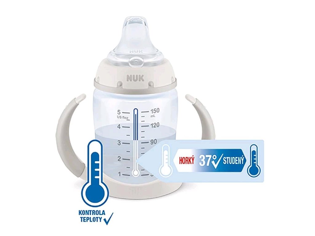 Dojčenská fľaša na učenie NUK First Choice s kontrolou teploty. Zabudovaný indikátor kontroly teploty zmení farbu, pokiaľ je obsah fľaštičky príliš horúci. Modrá farba indikátora sa zmení na bielu. Fľaštička bábätkám uľahčuje prechod od dojčenia alebo kŕmenia k samostatnému pitiu. Dojčenská fľaša má mäkké silikónové nekvapkajúce náustok a nemusíte sa báť vyliatia obsahu. Je ergonomicky tvarovaná a má protišmykové držadlá, takže si dieťa môže fľašu držať samo napríklad aj pri jazde v kočíku. Výhodou tejto super fľaštičky je, že sa ľahko rozmontujete a čistí. Vyrobená z vysoko kvalitného plastu polypropylénu a neobsahuje BPA (Bisfenol A). Vhodné pre deti od 6 do 18 mesiacov. Klinicky testované. Balenie obsahuje:- fľaštička s náustkom 150 ml