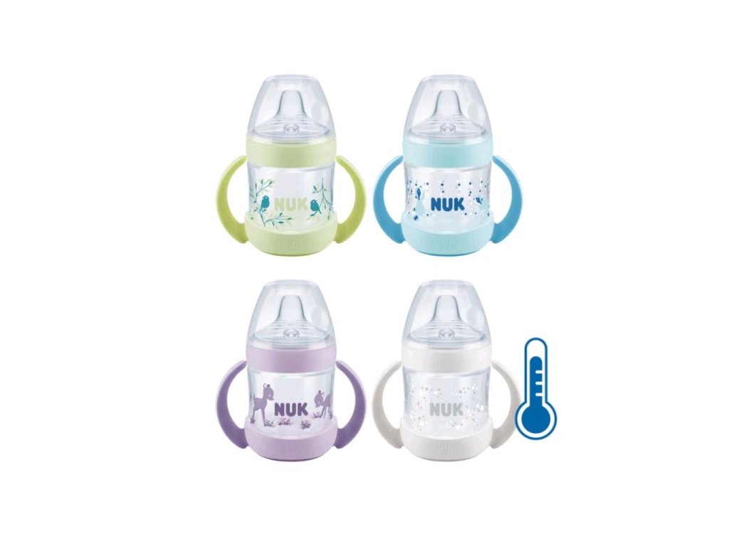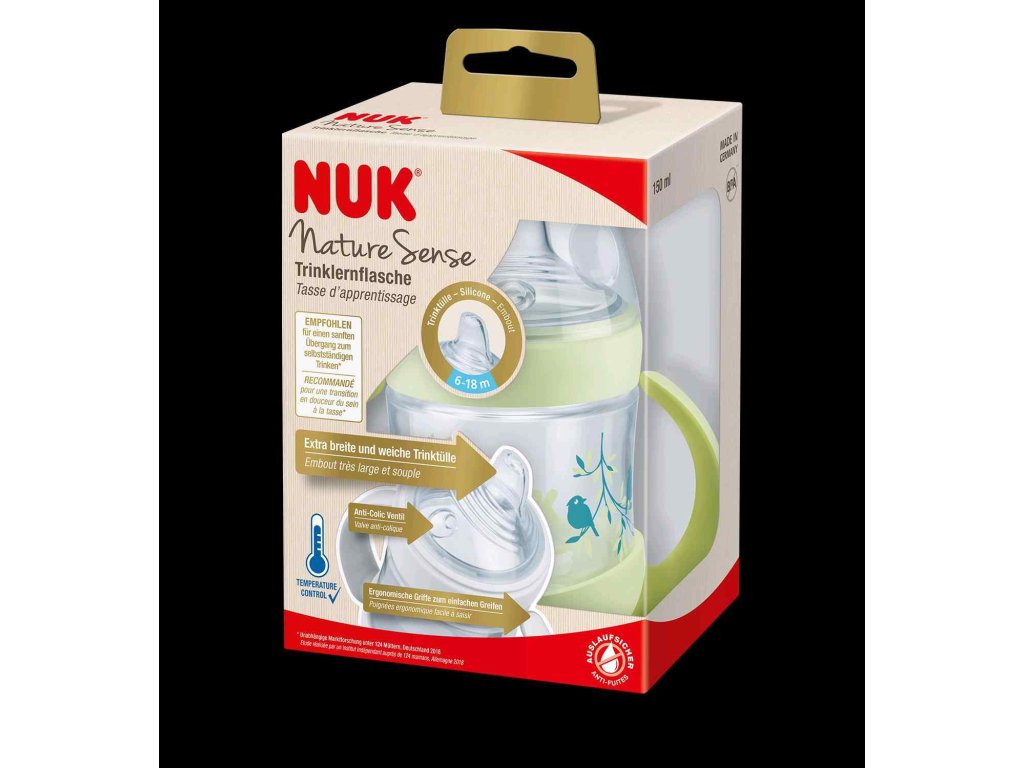 Dojčenská fľaša na učenie NUK Nature Sense 150 ml s kontrolou teploty. Zabudovaný indikátor kontroly teploty zmení farbu, pokiaľ je obsah fľaštičky príliš horúci. Modrá farba indikátora sa zmení na bielu. Fľaštička bábätkám uľahčuje prechod od dojčenia alebo kŕmenia k samostatnému pitiu. Dojčenská fľaša má extra široké a mäkké silikónové náustok a poskytuje vášmu dieťatku prirodzený pocit pitia hneď od začiatku. Je ergonomicky tvarovaná, má protišmykové dno pre stabilitu fľaštičky a protišmykové držadlá, takže si dieťa môže fľašu držať samo napríklad aj pri jazde v kočíku. Inovatívny antikolikový ventil navyše umožňuje neprerušované pitie pripomínajúce dojčenie a zabraňuje prehĺtaniu vzduchu. Nekvapkajúce náustok zaručuje prepravu bez vyliatia, takže sa fľaštička na učenie môže stať vaším verným spoločníkom na cestách. Výhodou tejto super fľaštičky je, že sa ľahko rozmontujete a čistí. Vyrobená z vysoko kvalitného plastu polypropylénu a neobsahuje BPA (Bisfenol A). Vhodné pre deti od 6 do 18 mesiacov. Klinicky testované. Balenie obsahuje:- fľaštička s náustkom 150 ml