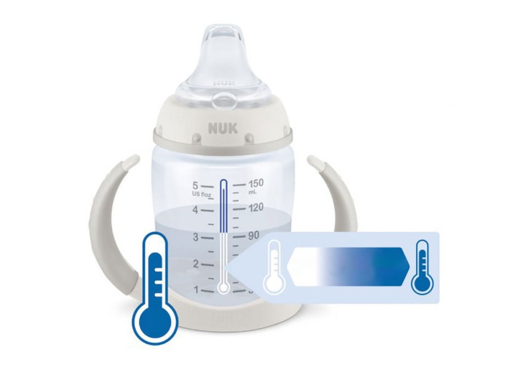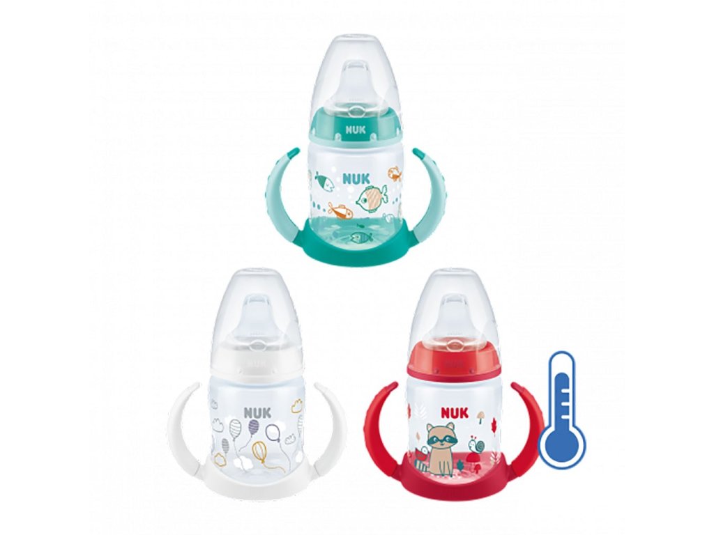 Dojčenská fľaša na učenie NUK First Choice s kontrolou teploty. Zabudovaný indikátor kontroly teploty zmení farbu, pokiaľ je obsah fľaštičky príliš horúci. Modrá farba indikátora sa zmení na bielu. Fľaštička bábätkám uľahčuje prechod od dojčenia alebo kŕmenia k samostatnému pitiu. Dojčenská fľaša má mäkké silikónové nekvapkajúce náustok a nemusíte sa báť vyliatia obsahu. Je ergonomicky tvarovaná a má protišmykové držadlá, takže si dieťa môže fľašu držať samo napríklad aj pri jazde v kočíku. Výhodou tejto super fľaštičky je, že sa ľahko rozmontujete a čistí. Vyrobená z vysoko kvalitného plastu polypropylénu a neobsahuje BPA (Bisfenol A). Vhodné pre deti od 6 do 18 mesiacov. Klinicky testované. Balenie obsahuje:- fľaštička s náustkom 150 ml