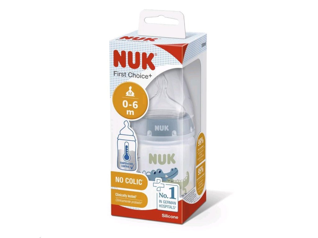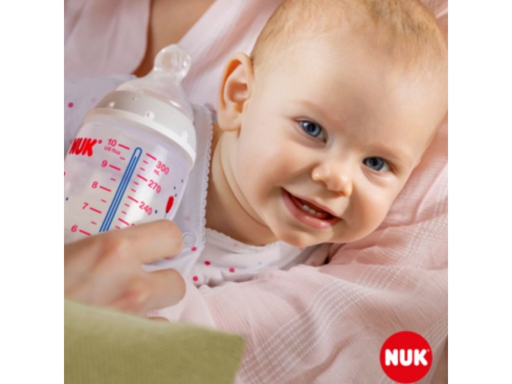 Dojčenská fľaša NUK First Choice s kontrolou teploty. Špeciálny tvar typický pre cumlíky NUK s ortodontickým antikolikovým cumlíkom je modelovaný podľa materskej bradavky pri dojčení. Dojčenské fľaše sú teraz vybavené novou NUK kontrolkou teploty a pomáhajú tak zabrániť tomu, aby vaše dieťa pilo príliš horúci príkrm. Kontrolka vyzerá ako teplomer, je umiestnená medzi ryskami a teplota obsahu fľaše zmení jej farbu. Vyrobená z vysoko kvalitného nerozbitného plastu polypropylénu a neobsahuje BPA (Bisfenol A). Obsah fľaše 150 ml. Vhodná pre deti od 0-6 mesiacov M (stredne veľký otvor = pre detskú výživu). Klinicky testované.Charekteristika: