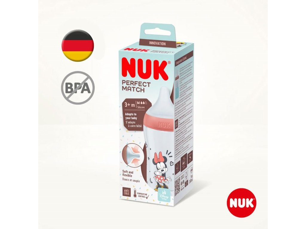 Dojčenská fľaša NUK Perfect Match MICKEY s kontrolou teploty a mäkkým silikónovým cumlíkom. Špeciálny tvar typický pre cumlíky NUK s ortodontickým antikolikovým cumlíkom je modelovaný podľa materskej bradavky pri dojčení. Ponecháva dostatok priestoru pre prirodzené sacie pohyby jazyka aj čeľuste. Veľká, široká opora pier pri pití pripomína matkinu pokožku. Fľaštička je navrhnutá tak, aby bábätko neprišlo do kontaktu s pevnými plastovými časťami. Vylepšený systém proti prehĺtaniu vzduchu pri pití Anti Colic Air System zaisťuje prirodzený tok mlieka, aby dieťa pilo uvoľnene bez prehĺtania vzduchu. Hladko sa zužujúci tvar s antikolikovou funkciou pre plynulý a nerušený prietok pitia, veľkosť M (od 3 m, pre materské mlieko). Dojčenské fľaše sú teraz vybavené novou NUK kontrolkou teploty a pomáhajú tak zabrániť tomu, aby vaše dieťa pilo príliš horúci príkrm. Kontrolka vyzerá ako teplomer, je umiestnená medzi ryskami a teplota obsahu fľaše zmení jej farbu. Pokiaľ je príkrm príliš horúci, modrá kontrolka sa zmení na bielu. V ideálnom prípade by mal príkrm mať telesnú teplotu (37 °C), čo zodpovedá modrému zafarbeniu displeja. Vyrobená z vysoko kvalitného nerozbitného plastu polypropylénu a neobsahuje BPA (Bisfenol A). Obsah fľaše 260 ml. Vhodná pre deti od 3 mesiacov, M od 3 m pre materské mlieko). Klinicky testované.Charekteristika: