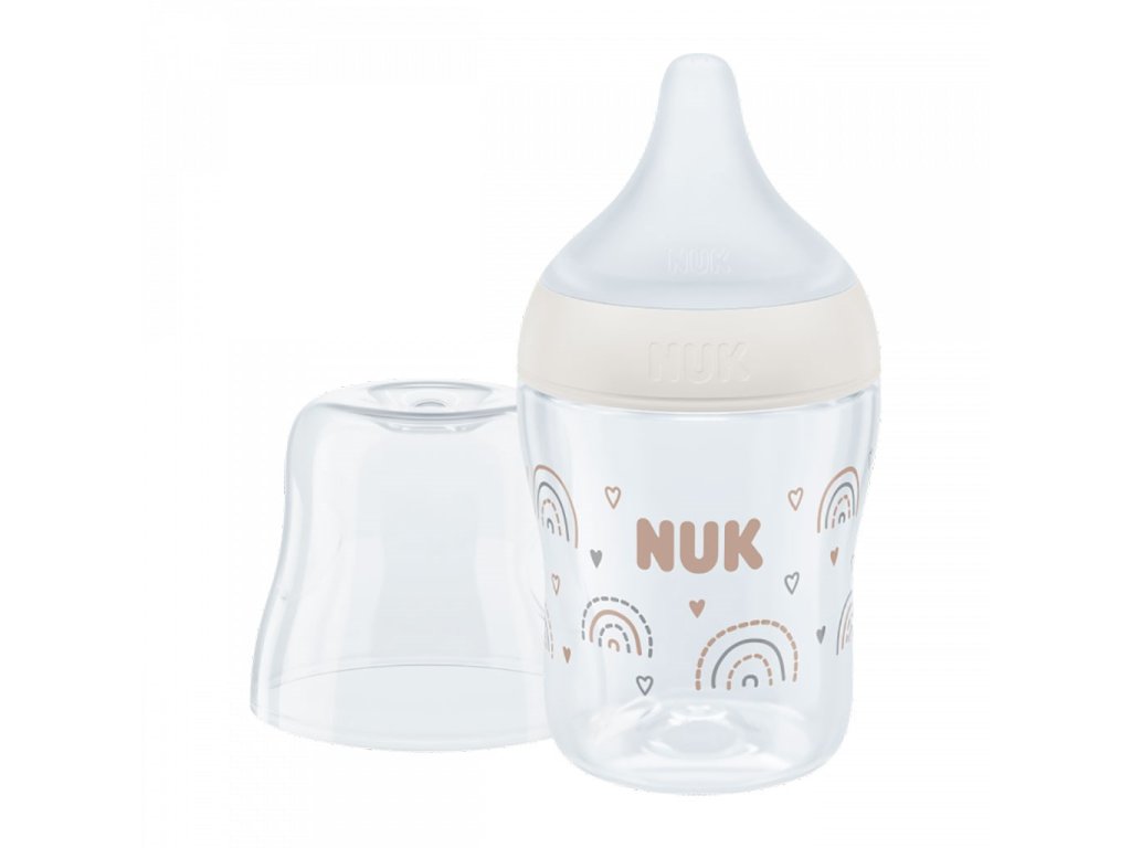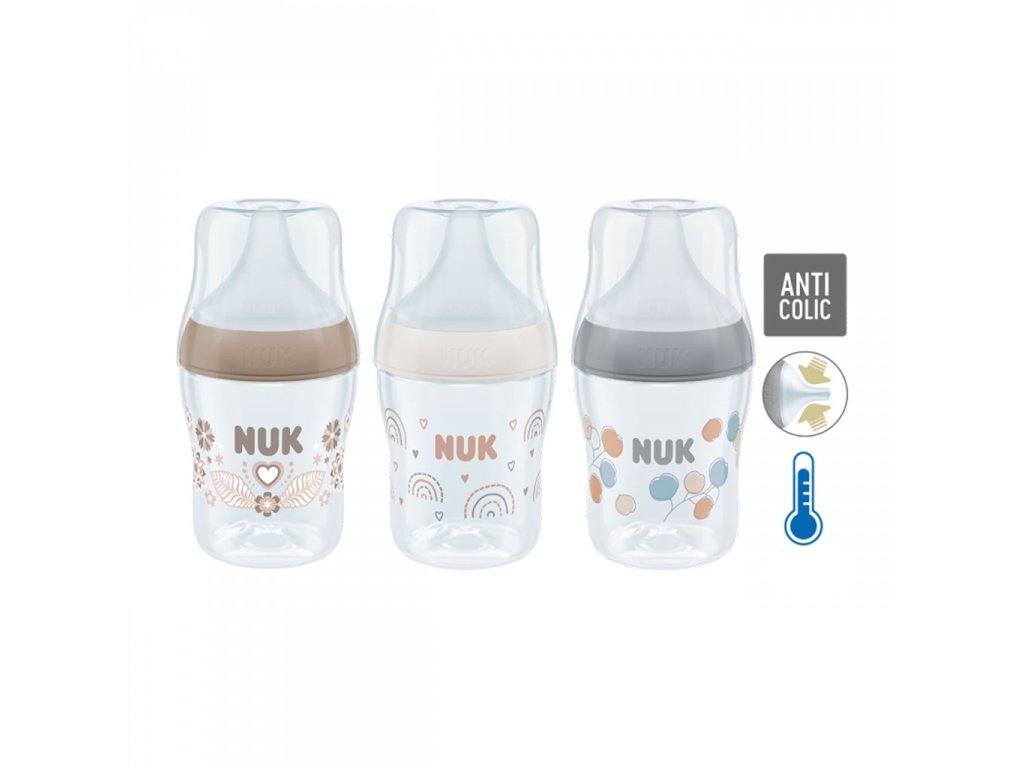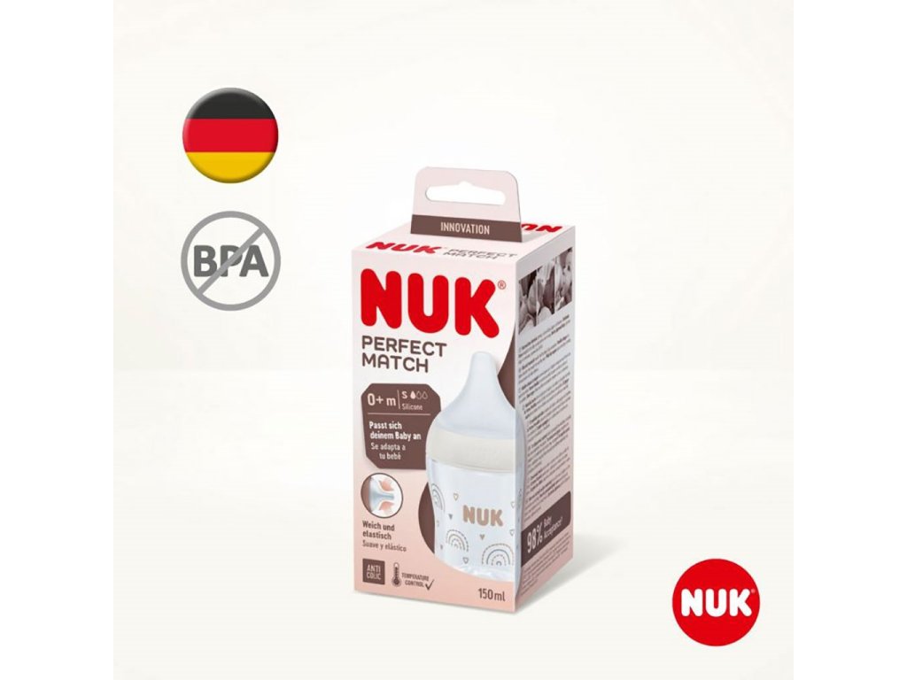 Dojčenská fľaša NUK Perfect Match s kontrolou teploty a mäkkým silikónovým cumlíkom. Špeciálny tvar typický pre cumlíky NUK s ortodontickým antikolikovým cumlíkom je modelovaný podľa materskej bradavky pri dojčení. Ponecháva dostatok priestoru pre prirodzené sacie pohyby jazyka aj čeľuste. Veľká, široká opora pier pri pití pripomína matkinu pokožku. Fľaštička je navrhnutá tak, aby bábätko neprišlo do kontaktu s pevnými plastovými časťami. Vylepšený systém proti prehĺtaniu vzduchu pri pití Anti Colic Air System zaisťuje prirodzený tok mlieka, aby dieťa pilo uvoľnene bez prehĺtania vzduchu. Hladko sa zužujúci tvar s antikolikovou funkciou pre plynulý a nerušený prietok pitia, veľkosť S (od narodenia, pre materské mlieko, čaj alebo vodu). Dojčenské fľaše sú teraz vybavené novou NUK kontrolkou teploty a pomáhajú tak zabrániť tomu, aby vaše dieťa pilo príliš horúci príkrm. Kontrolka vyzerá ako teplomer, je umiestnená medzi ryskami a teplota obsahu fľaše zmení jej farbu. Pokiaľ je príkrm príliš horúci, modrá kontrolka sa zmení na bielu. V ideálnom prípade by mal príkrm mať telesnú teplotu (37 °C), čo zodpovedá modrému zafarbeniu displeja. Vyrobená z vysoko kvalitného nerozbitného plastu polypropylénu a neobsahuje BPA (Bisfenol A). Obsah fľaše 150 ml. Vhodná pre deti od narodenia, S (malý otvor = pre materské mlieko, vodu, čaj). Klinicky testované.Charekteristika: