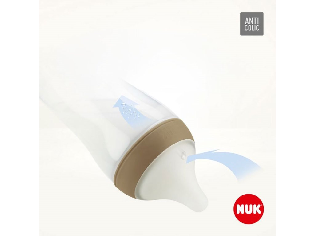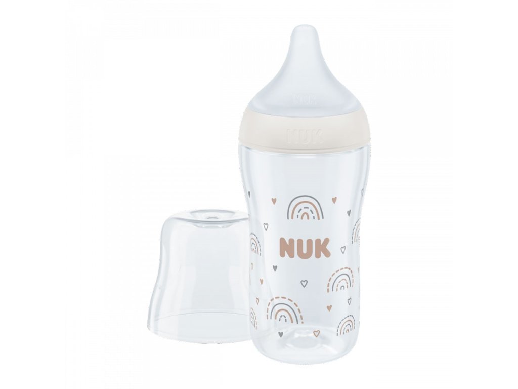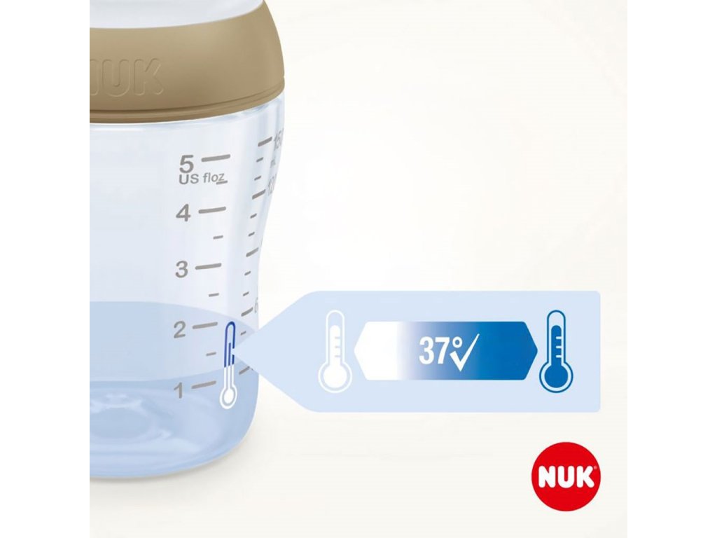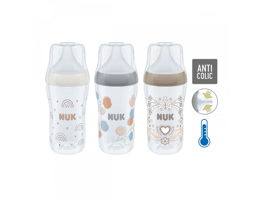 Dojčenská fľaša NUK Perfect Match s kontrolou teploty a mäkkým silikónovým cumlíkom. Špeciálny tvar typický pre cumlíky NUK s ortodontickým antikolikovým cumlíkom je modelovaný podľa materskej bradavky pri dojčení. Ponecháva dostatok priestoru pre prirodzené sacie pohyby jazyka aj čeľuste. Veľká, široká opora pier pri pití pripomína matkinu pokožku. Fľaštička je navrhnutá tak, aby bábätko neprišlo do kontaktu s pevnými plastovými časťami. Vylepšený systém proti prehĺtaniu vzduchu pri pití Anti Colic Air System zaisťuje prirodzený tok mlieka, aby dieťa pilo uvoľnene bez prehĺtania vzduchu. Hladko sa zužujúci tvar s antikolikovou funkciou pre plynulý a nerušený prietok pitia, veľkosť M (od 3 m, pre materské mlieko). Dojčenské fľaše sú teraz vybavené novou NUK kontrolkou teploty a pomáhajú tak zabrániť tomu, aby vaše dieťa pilo príliš horúci príkrm. Kontrolka vyzerá ako teplomer, je umiestnená medzi ryskami a teplota obsahu fľaše zmení jej farbu. Pokiaľ je príkrm príliš horúci, modrá kontrolka sa zmení na bielu. V ideálnom prípade by mal príkrm mať telesnú teplotu (37 °C), čo zodpovedá modrému zafarbeniu displeja. Vyrobená z vysoko kvalitného nerozbitného plastu polypropylénu a neobsahuje BPA (Bisfenol A). Obsah fľaše 260 ml. Vhodná pre deti od 3 mesiacov, M od 3 m pre materské mlieko). Klinicky testované.Charekteristika: