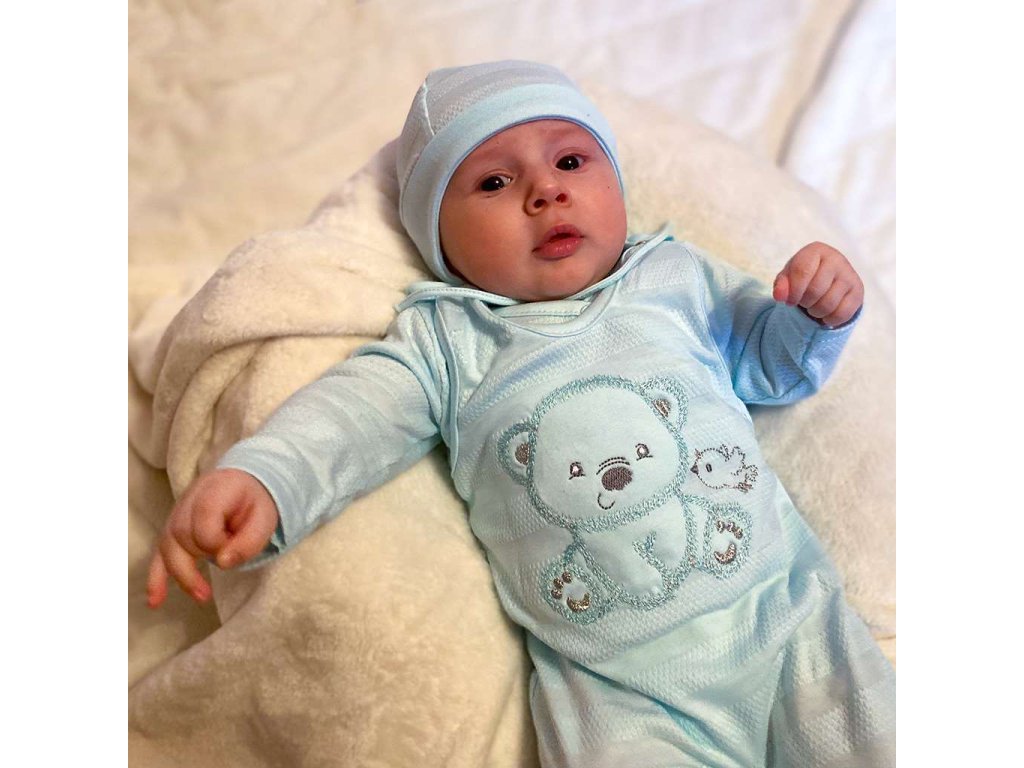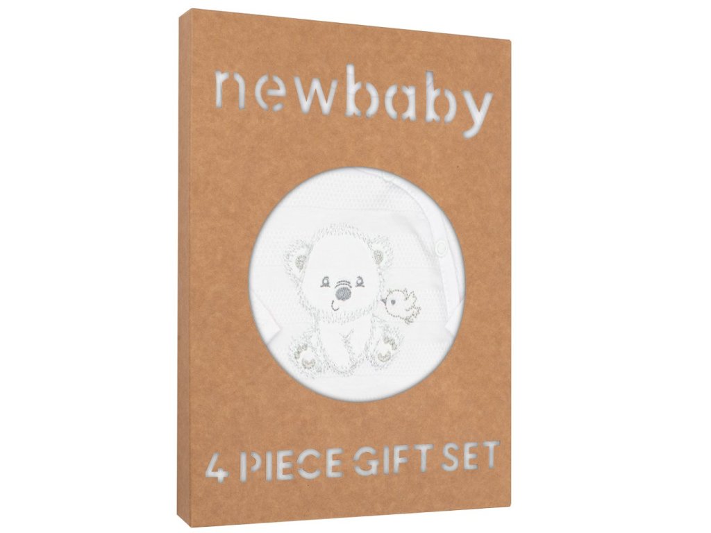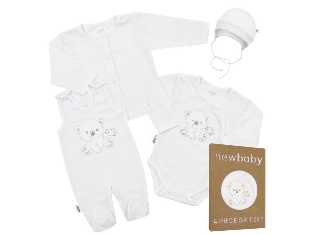 4-dielna súpravička českej značky New Baby Sweet Bear pre bábätká. Súpravička je vyrobená z kvalitného materiálu, ktorý je vhodný pre bábätká a je vhodná nielen do pôrodnice. Obsahuje celorozopínacie body s dlhým rukávom, dupačky, kabátik a čiapočku. Celorozopínacie body zdobia vyšitý obrázok medvedíka a vtáčika. Dupačky zdobia roztomilý obrázok medvedíka a vtáčika. Zapínanie na cvočky na ramienkach a medzi nožičkami. Kabátik je jednofarebný s krásnym lemovaním okolo ručičiek. Zapínanie je na cvočky po celej dĺžke. Čiapočka je krásne tvarovaná na ušká a zaväzuje sa na šnúrky. Súpravička je v praktickej Eko krabičke. Celá súpravička má nový neobyčajný dizajn s atraktívnym vzorom látky. Zloženie: 100% bavlna.Dodatočné parametre