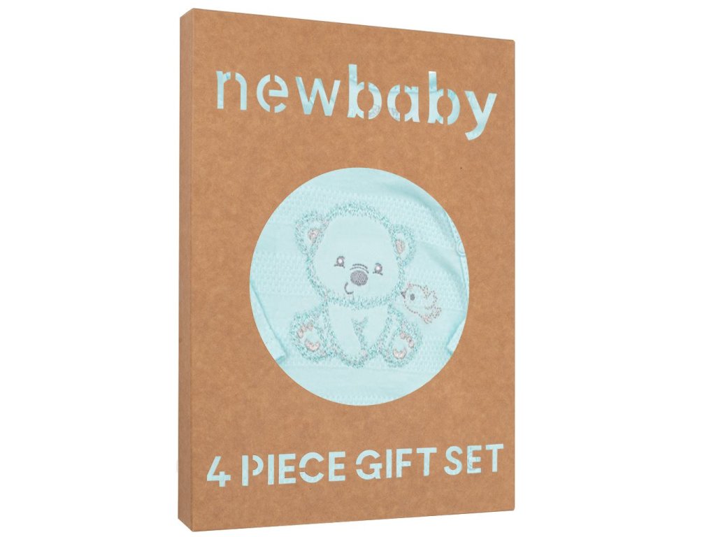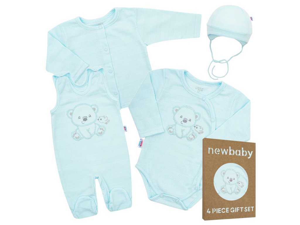 4-dielna súpravička českej značky New Baby Sweet Bear pre bábätká. Súpravička je vyrobená z kvalitného materiálu, ktorý je vhodný pre bábätká a je vhodná nielen do pôrodnice. Obsahuje celorozopínacie body s dlhým rukávom, dupačky, kabátik a čiapočku. Celorozopínacie body zdobia vyšitý obrázok medvedíka a vtáčika. Dupačky zdobia roztomilý obrázok medvedíka a vtáčika. Zapínanie na cvočky na ramienkach a medzi nožičkami. Kabátik je jednofarebný s krásnym lemovaním okolo ručičiek. Zapínanie je na cvočky po celej dĺžke. Čiapočka je krásne tvarovaná na ušká a zaväzuje sa na šnúrky. Súpravička je v praktickej Eko krabičke. Celá súpravička má nový neobyčajný dizajn s atraktívnym vzorom látky. Zloženie: 100% bavlna.Dodatočné parametre