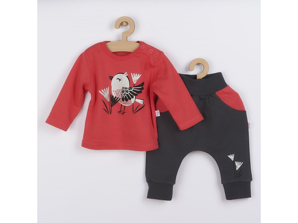 2-dielna bavlnená súprava Koala Birdy. Súčasťou súpravičky sú tepláčiky a tričko. Tepláčiky majú moderný strih so zníženým sedom, ktorý im dodáva ten správny šmrc, sú zdobené obrázkom a ukončené širokým pružným lemom. Tričko je zdobené roztomilým obrázkom. Praktické zapínanie na cvočky na ramienku veľmi uľahčí obliekanie. Materiál: 100% bavlna.Dodatočné parametre