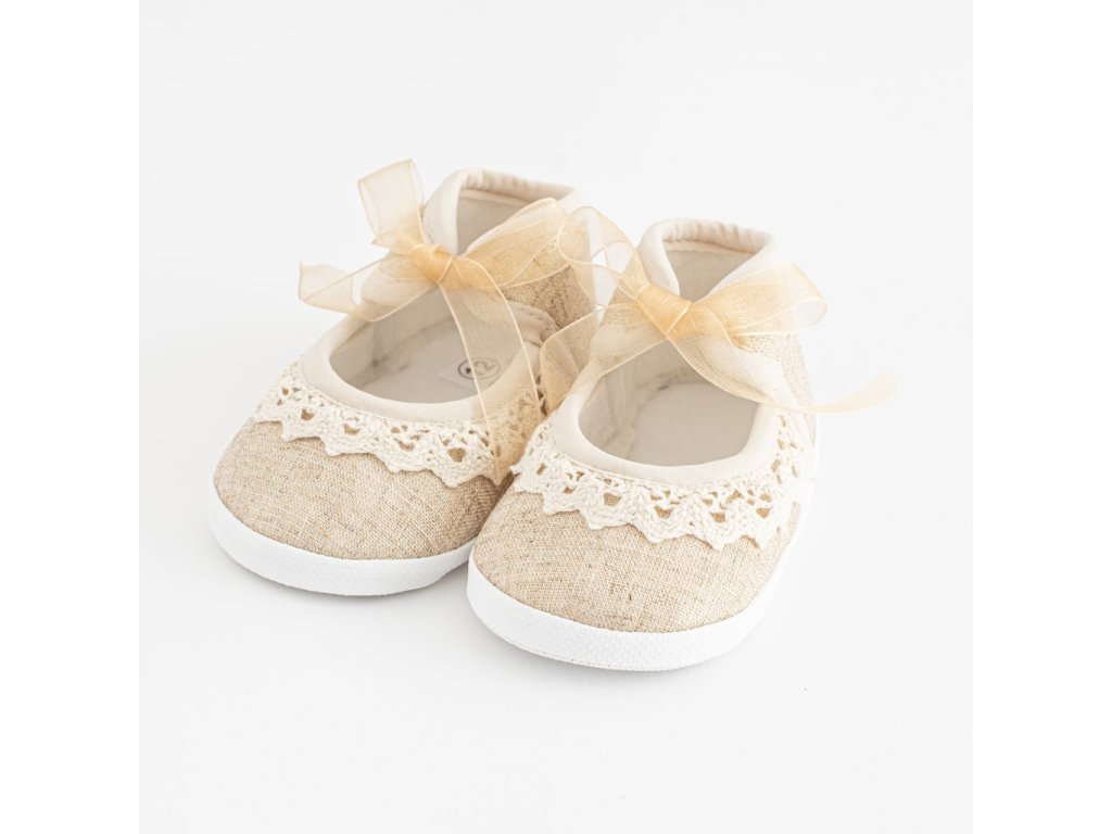 Dojčenské capáčky New Baby pre bábätká. Krásne topánočky sú v štýle dievčenských sandálok s moderným vzhľadom na zaväzovanie. Capáčky priliehajú k nožičke a majú široké vnútro, čo umožňuje voľný pohyb prstov a svalov. Výrobok nie je určený na chôdzu. Sú veľmi ľahké s tenkou syntetickou podrážkou. Zloženie: čipka: 100% polyester. Podrážka: syntetický materiál PVC bez BPA. Dĺžka vnútornej stielky 11 cm. Určené pre deti 3-6 mesiacov. Dodávané v praktickej krabičke. Upozornenie: pod textilnou vložkou sa niekedy nachádza papierová vložka, ktorá drží tvar capáčky. Pred prvým použitím odstráňte túto papierovú vložku.Dodatočné parametre