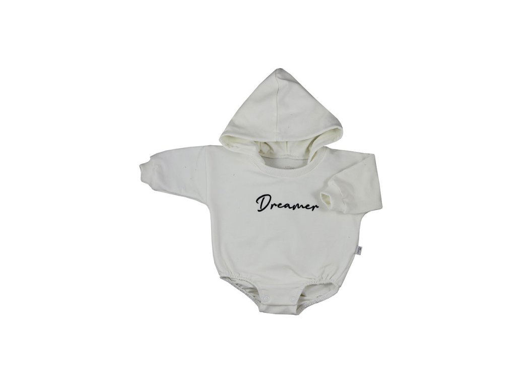 Nápadité body s dlhým rukávom a kapucňou Koala Dreamer. Body má zapínanie na cvočky medzi nožičkami čo uľahčuje obliekanie a prebaľovanie. Okolo krčka je pružný lem pre ľahké obliekanie cez hlavičku. Je zdobené nápisom Dreamer a je ušité v štýle baggy z veľmi príjemnej teplákoviny. Body je pre bábätká dôležitým kúskom oblečenia. Pri akomkoľvek pohybe sú chrbát bábätka stále prikryté. Materiál: 96% bavlna, 4% elastan.Dodatočné parametre