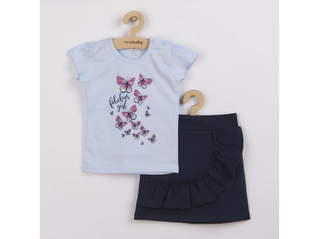 2-dielna súpravička pre dievčatká českej značky New Baby Butterflies. Súpravička sa skladá z trička a sukienky. Tričko s krátkymi nariasenými rukávmi je zdobené obrázkom motýlikov. Zapínanie na ramienku na cvočky uľahčí obliekanie cez hlavičku bábätka. Tmavo modrú sukienku zdobí krásny volánik, ktorý dodáva sukienke ten správny šmrnc. V páse je širšia guma, ktorá netlačí na bruško bábätka. Zloženie: tričko: 100% bavlna, sukienka: 95% bavlna, 5% elastan.Dodatočné parametre