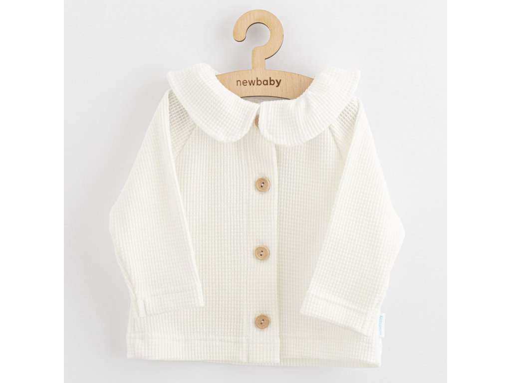 Elegantný dojčenský kabátik-svetrík. New Baby Laura. Dievčenský kabátik s krásnym golierom má praktické zapínanie na gombíky. Krásne drevené gombíky dodajú kabátiku elegantný vzhľad. Vďaka vzoru a vzhľadu kabátik hravo nahradí svetrík vo výbavičke dievčatiek. Je vyrobený z vysoko kvalitného materiálu. Vhodný na celoročné nosenie pre každý deň aj príležitosť. Zloženie: 100% bavlna.Dodatočné parametre