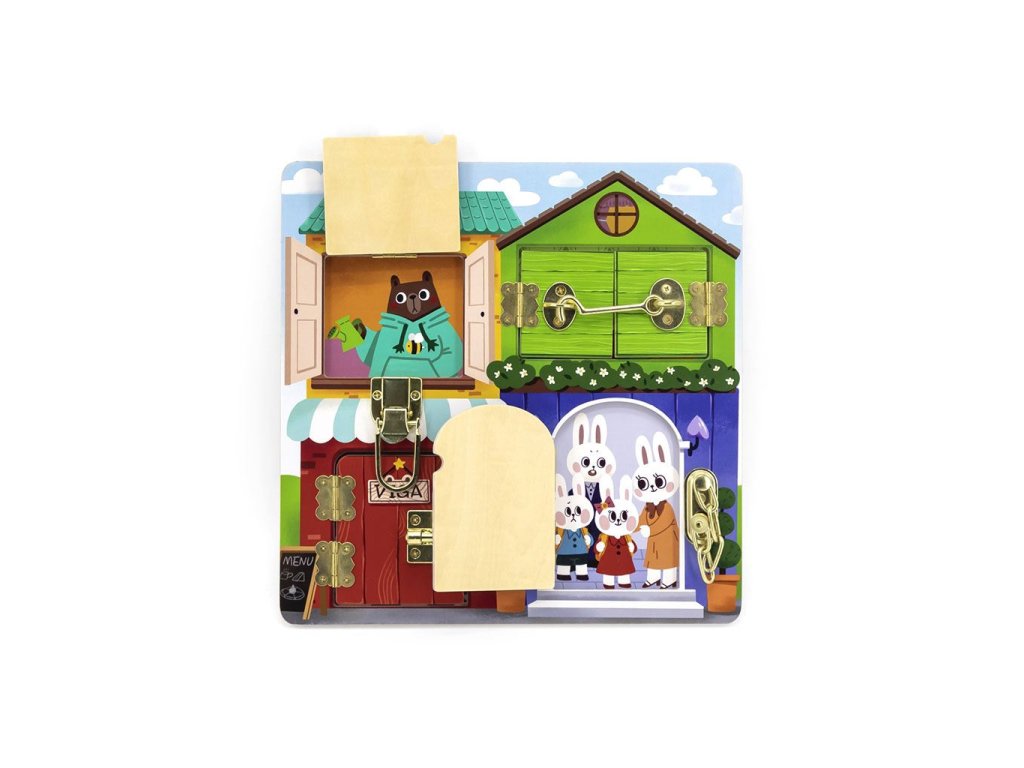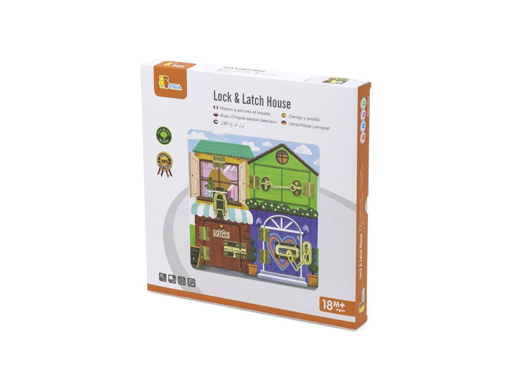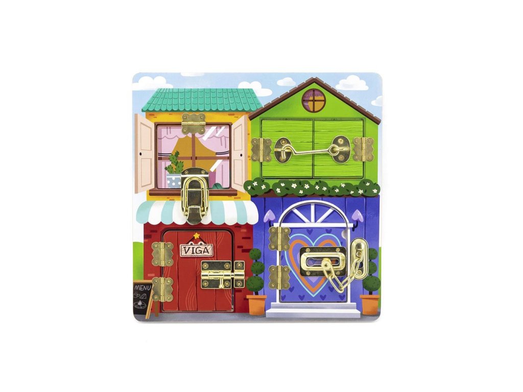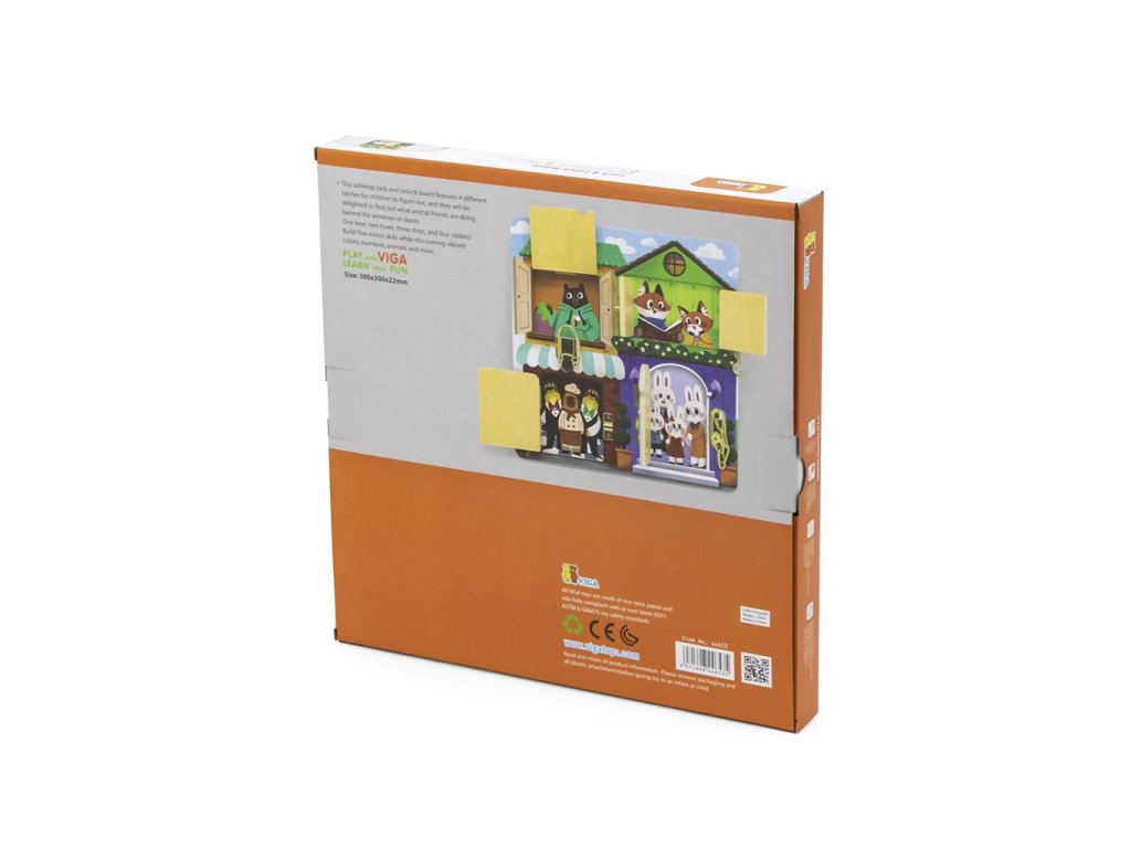 Drevená manipulačná doska v tvare domčeka výborne rozvíja zmyslové a logické myslenie dieťaťa. Hračka navrhnutá spoločnosťou Viga svojim neobvyklým tvarom rozvíja predstavivosť dieťaťa, ktoré "otvára a zatvára" zámky na senzorickej doske. Na drevenej doske sú 4 páry dverí a za každými dverami je iný obrázok. Hrajúce sa batoľa musí vymyslieť, ako otvoriť rôzne typy zámkov, a keď sa mu to podarí, uvidia za dverami rôzne zvieratká: jedného medvedíka, dve líšky, tri psy alebo štyri králiky. Každé dvere sa zatvárajú iným typom zámku.