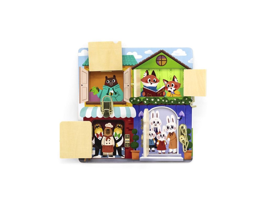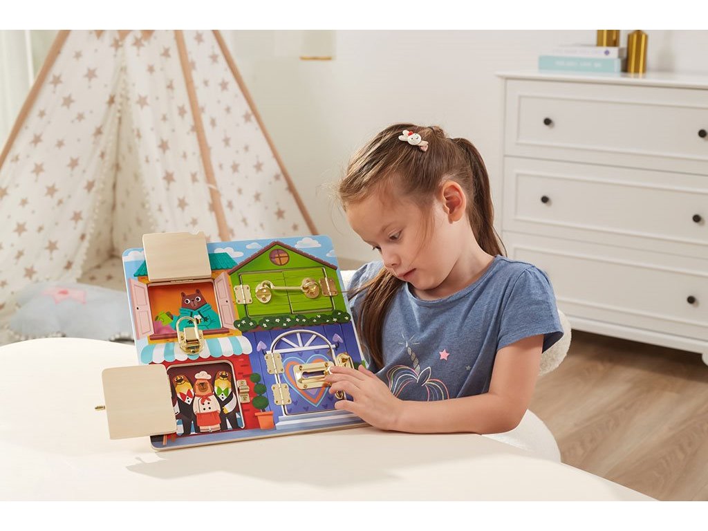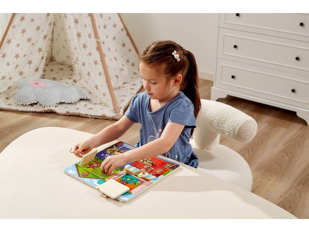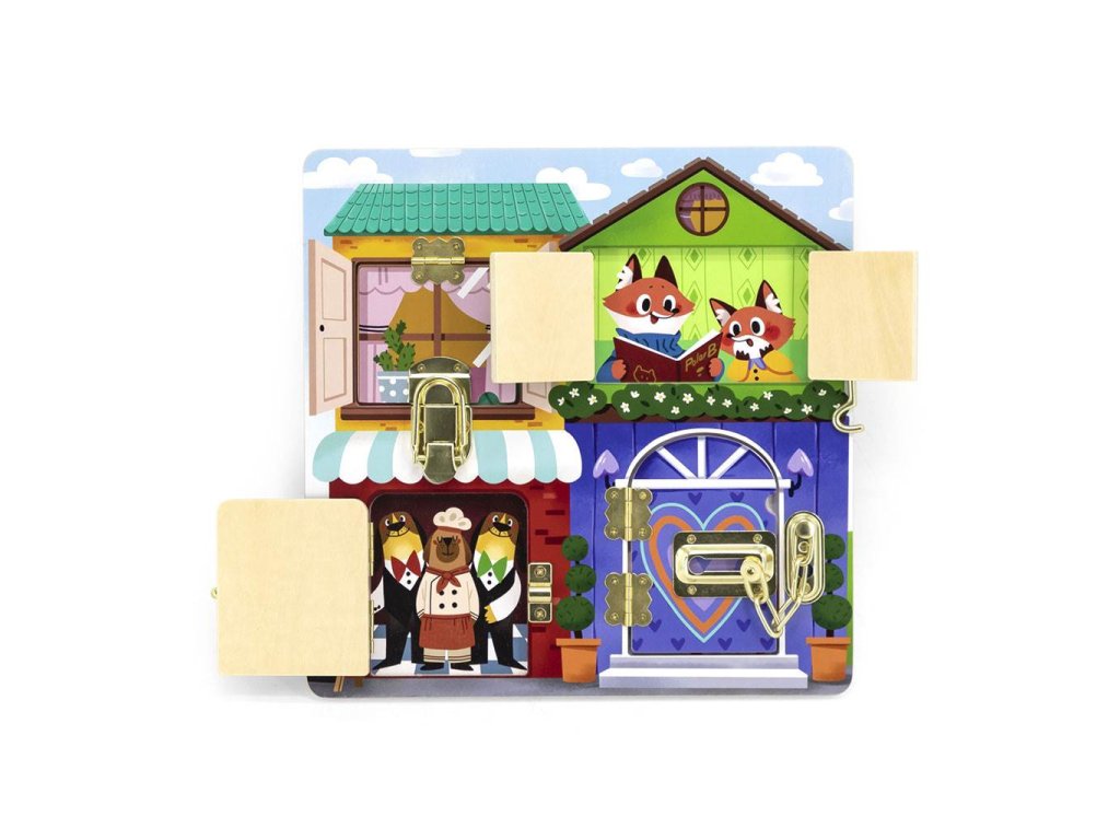 Drevená manipulačná doska v tvare domčeka výborne rozvíja zmyslové a logické myslenie dieťaťa. Hračka navrhnutá spoločnosťou Viga svojim neobvyklým tvarom rozvíja predstavivosť dieťaťa, ktoré "otvára a zatvára" zámky na senzorickej doske. Na drevenej doske sú 4 páry dverí a za každými dverami je iný obrázok. Hrajúce sa batoľa musí vymyslieť, ako otvoriť rôzne typy zámkov, a keď sa mu to podarí, uvidia za dverami rôzne zvieratká: jedného medvedíka, dve líšky, tri psy alebo štyri králiky. Každé dvere sa zatvárajú iným typom zámku.