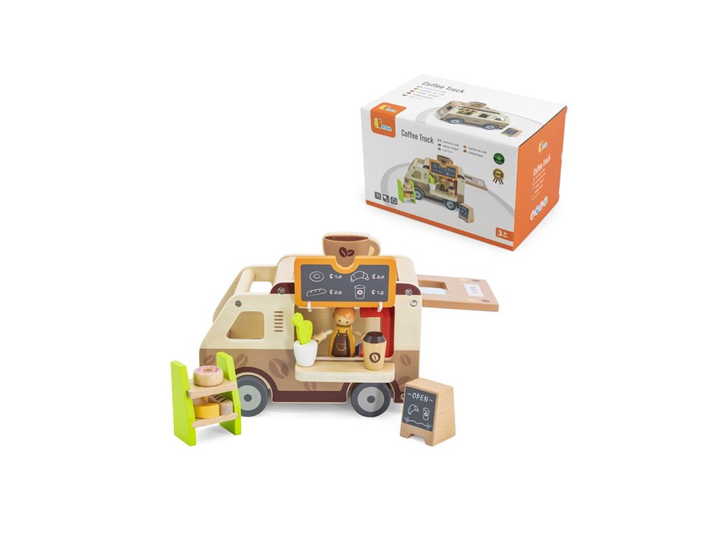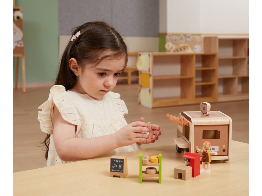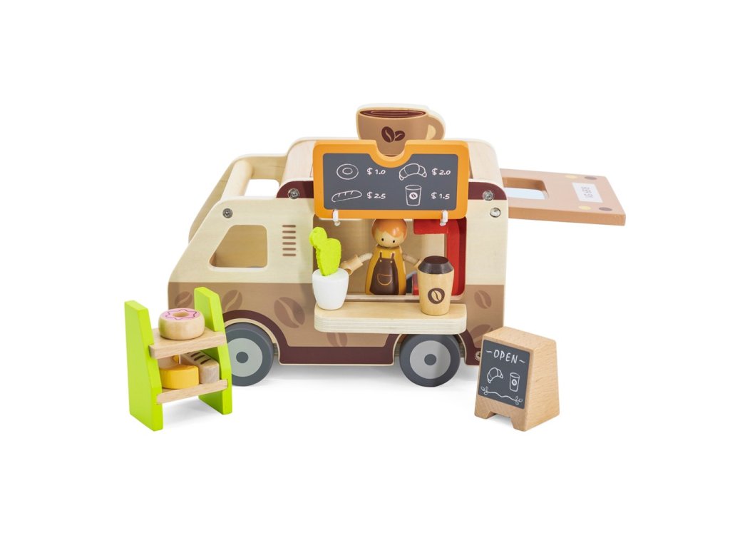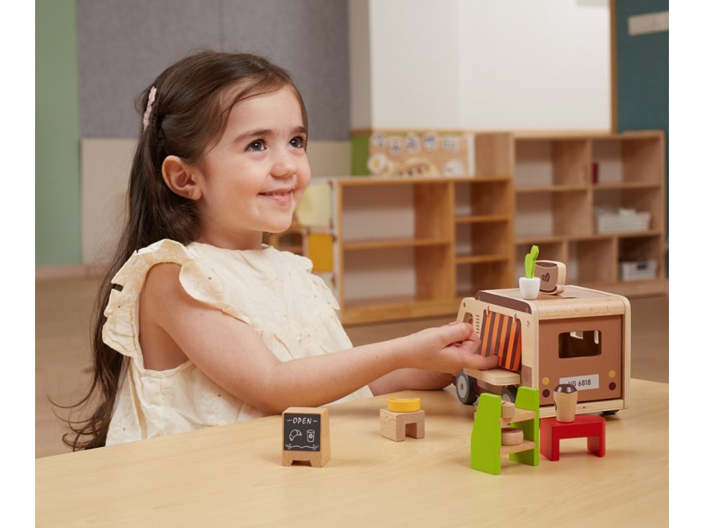 Drevená mobilná kaviarnička je mimoriadne kreatívna a starostlivo spracovaná hračka, ktorá deti privádza do fascinujúceho sveta kaviarenských dobrodružstiev. Vďaka realistickým prvkom môžu deti vystúpiť v úlohe baristu a obsluhovať svojich „zákazníkov“, čo robí hru veľmi pútavú. Kaviarnička nielen baví, ale taktiež podporuje rozvoj dieťaťa v mnohých smeroch: rozvíja fantáziu, motoriku i sociálne zručnosti. Hra na prípravu kávy a podávanie pokrmov rozvíja empatiu aj komunikačné schopnosti a učia deti interakciu v rôznych situáciách.