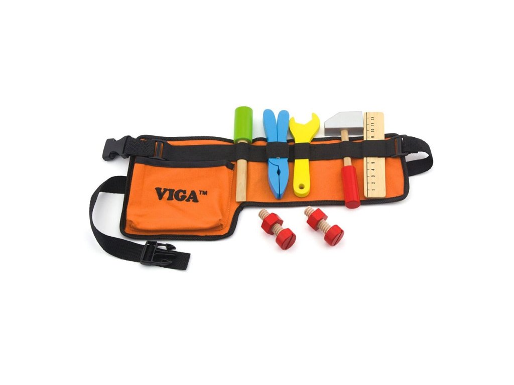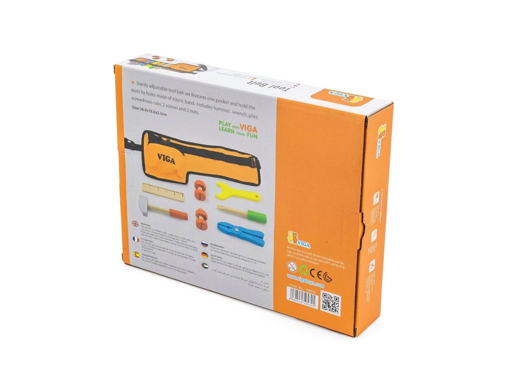 Robustný pásik s náradím, pripevnený plastovou sponou/prackou s možnosťou nastavenia - umožňuje prispôsobenie detskej postave. Opasok má priestranné vrecko na skrutky a rôzne drobnosti a tiež špeciálne pútka na náradie.