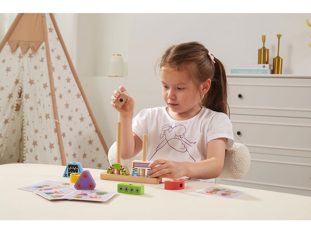 Celá hračka je vyrobená z bukového dreva s mäkkými hranami a je natretá netoxickými farbami v tlmených farbách, ktoré upútajú pozornosť a podporia hru a zároveň poskytnú veľa zábavy.