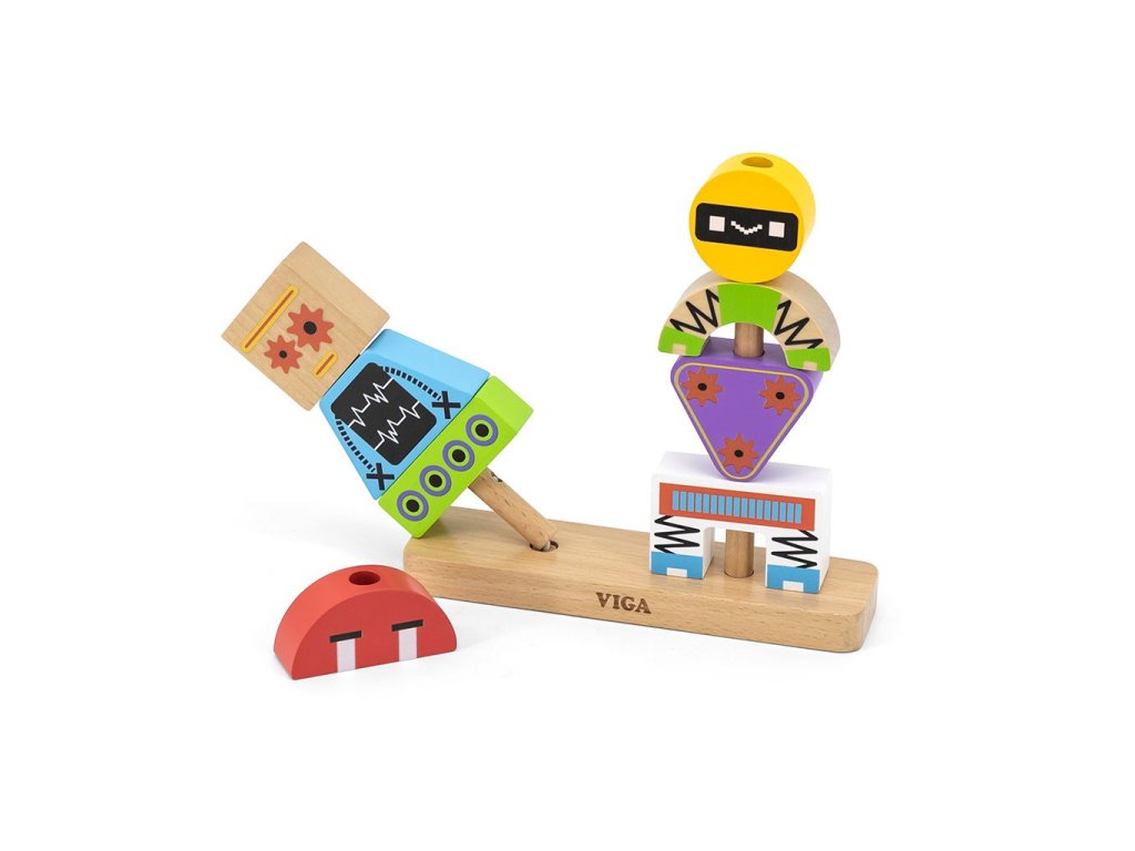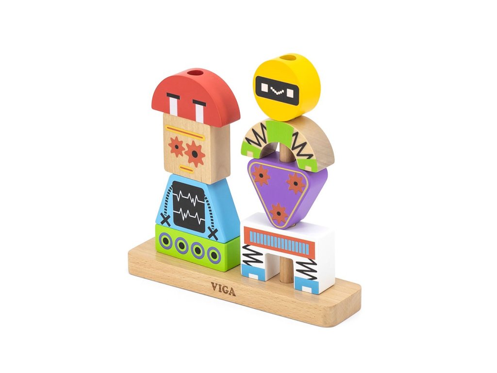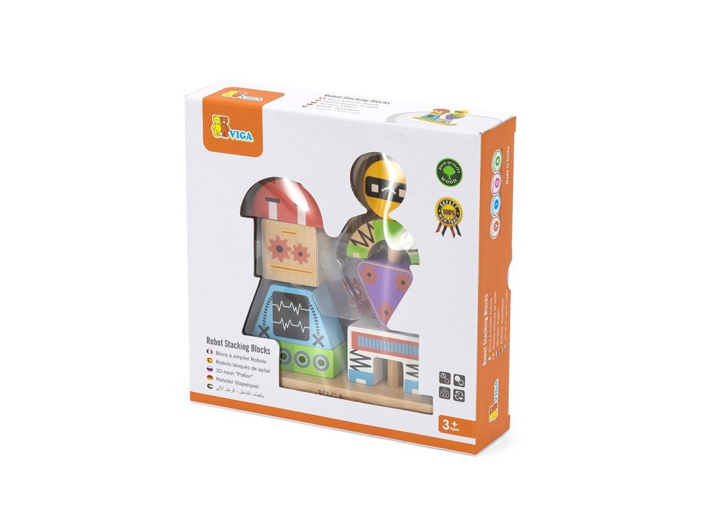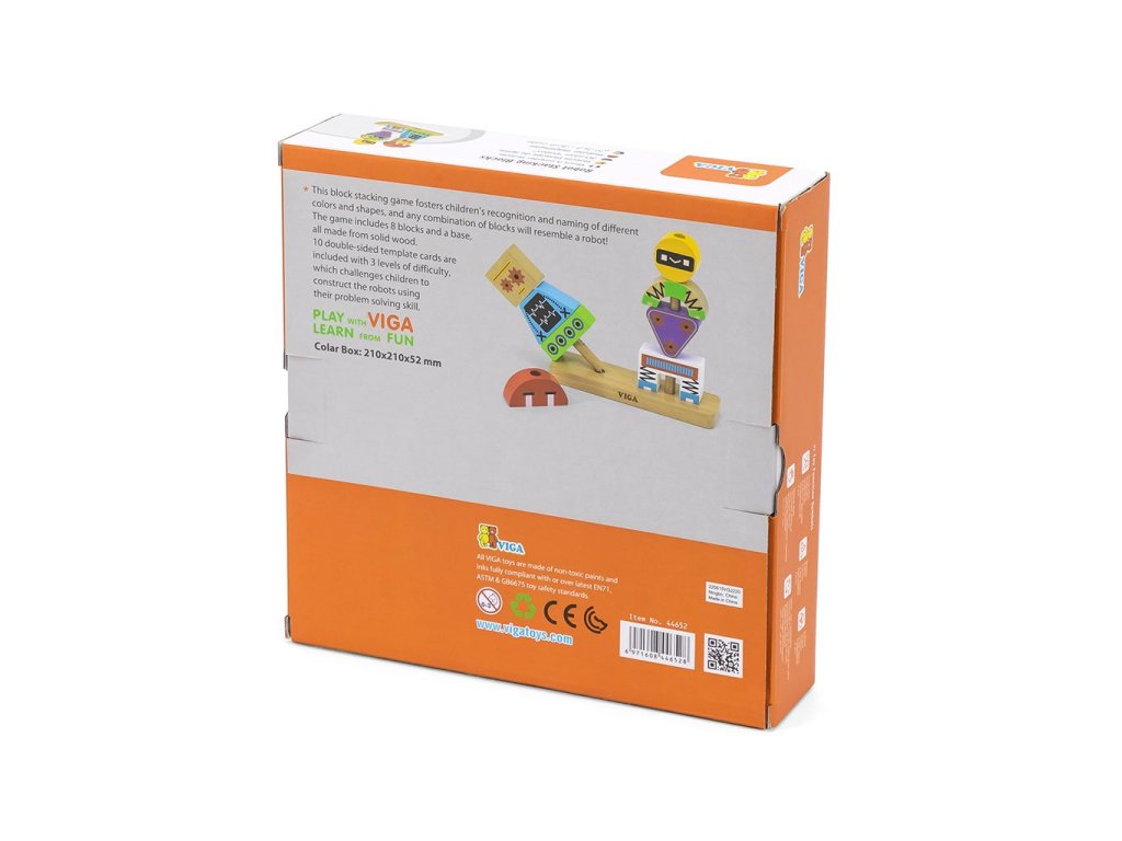 Skladačky - Roboti od spoločnosti Viga sú ideálnym darčekom pre dieťa, ktorý podporí jeho rozvoj a uľahčí vzdelávanie. Dieťa na základe priložených kartičiek - predlôh rozdelených podľa obtiažnosti, musí usporiadať roboty do rôznych konfigurácií. Prvá úroveň obtiažnosti sa skladá zo 6 kartičiek, druhá úroveň obtiažnosti sa skladá aj zo 6 kartičiek s náročnejším usporiadaním kociek a tretia úroveň obtiažnosti sa skladá z 10 kartičiek, na ktorých sú vyznačené iba obrysy kociek. Batoľatá majú možnosť tvoriť podľa svojej fantázie a usporiadať si z dostupných prvkov vlastný vzhľad robotov.