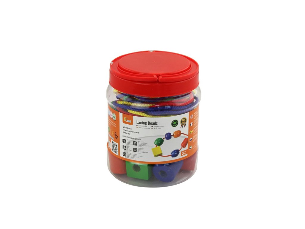 Balenie obsahuje 30 kusov farebných korálikov rôznych tvarov a 4 kusy navliekacej šnúrky. Posúvaním drevených korálikov po šnúrke môžu deti vytvárať nekonečné vzory a kombinovať rôzne tvary a farby.