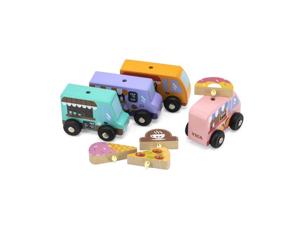 Štyri Food Trucky majú možnosť pripevniť na strechu prvok s obrázkom vhodným pre kaviareň, zmrzlináreň, cukráreň a pizzeriu. Drevené autíčka sú ideálne pre hru vo vnútri aj vonku.