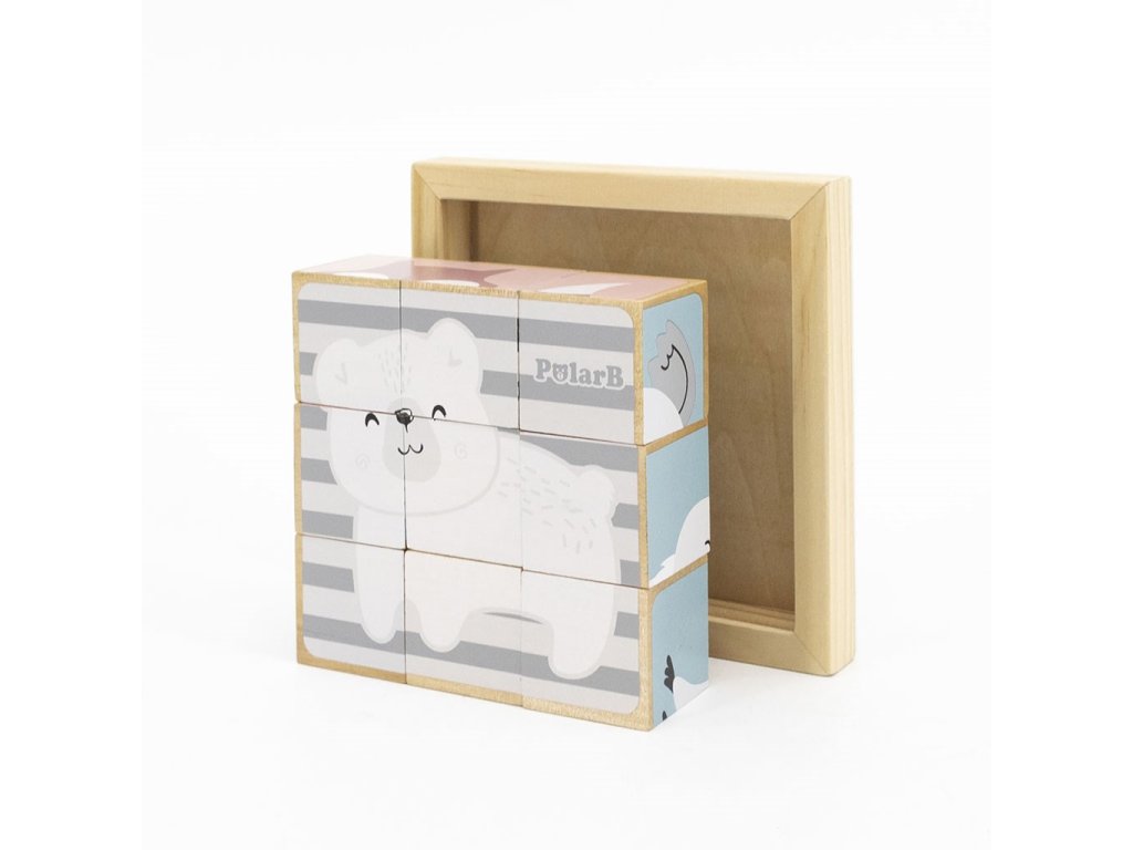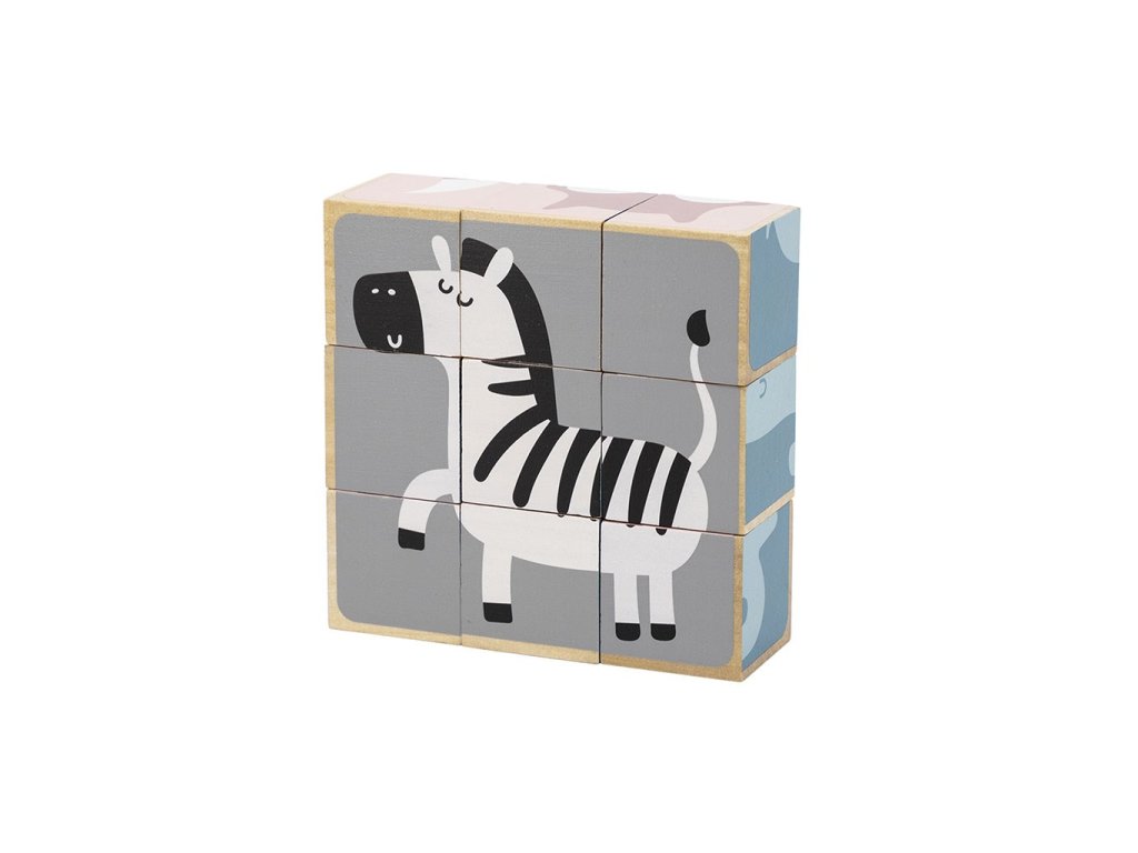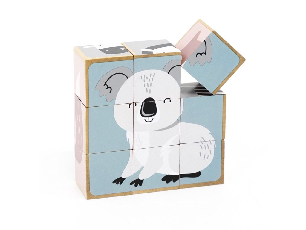 Rozvíjajte zručnosti svojho dieťaťa s klasickou hračkou z drevených kociek. Z 9 kociek vaše dieťa vytvorí na drevenom podklade 6 obrázkov znázorňujúcich tieto zvieratká: zebru, medvedíka koalu, medveďa, slona, kuriatka a ježka.