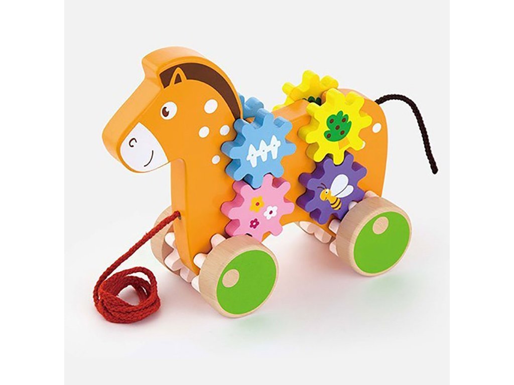 Pestrofarebný ťahací koník je nepostrádateľným kamarátom na prvé prechádzky každého dieťaťa. Dizajn hračky obsahuje ozubené kolieska, ktoré predstavujú rôzne tvary alebo rastliny. Ozubené kolieska sa pri ťahaní hračky otáčajú, čím viac priťahujú jeho pozornosť a vyvolávajú úsmev. Hračka sa skladá zo zvieratka psíka, 4 ozubených koliesok a silného povrázku, ktorý slúži na ťahanie hračky. Zvieratko je vyrobené z bukového dreva, natreté nezávadnými farbami.