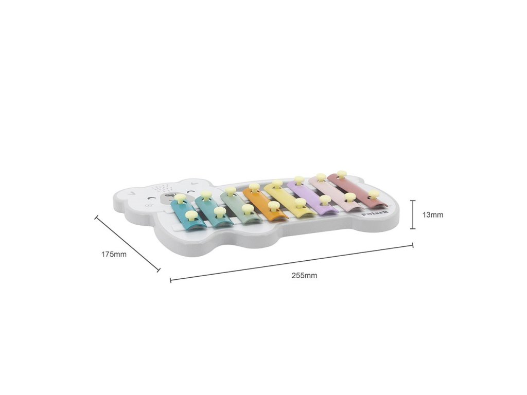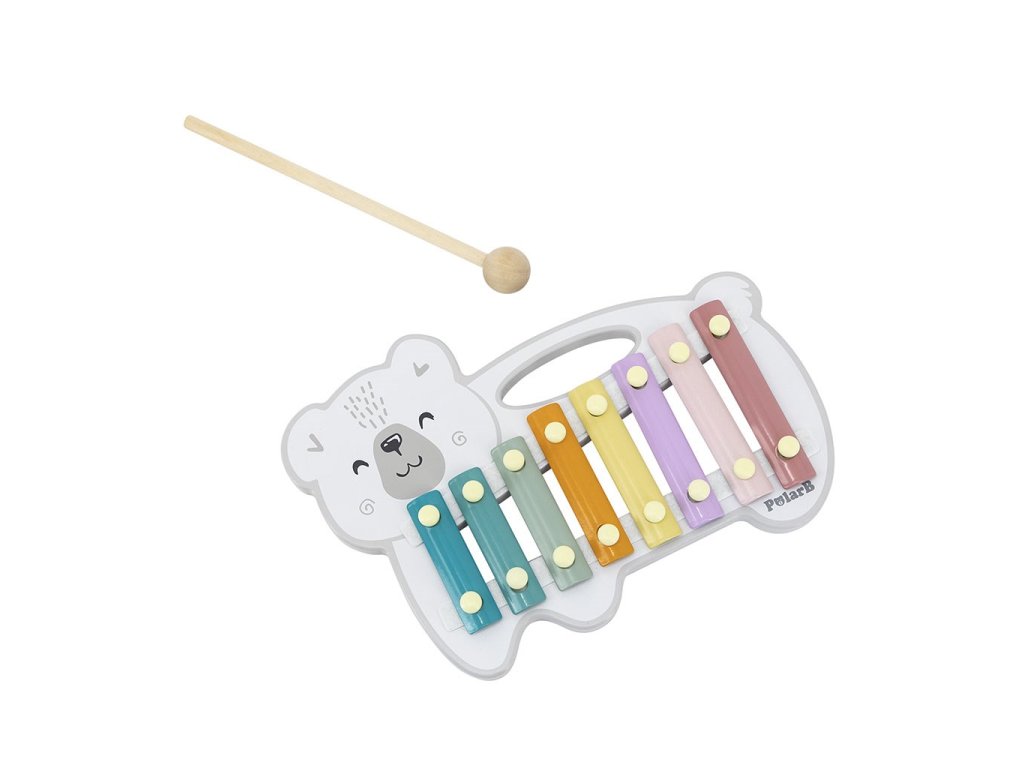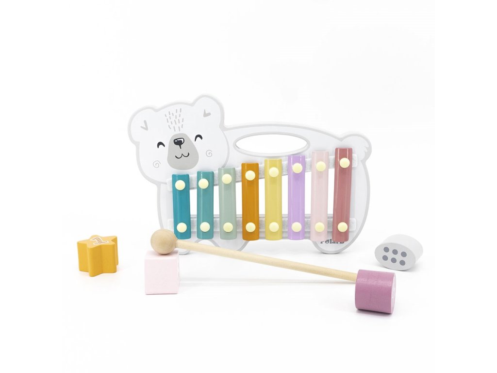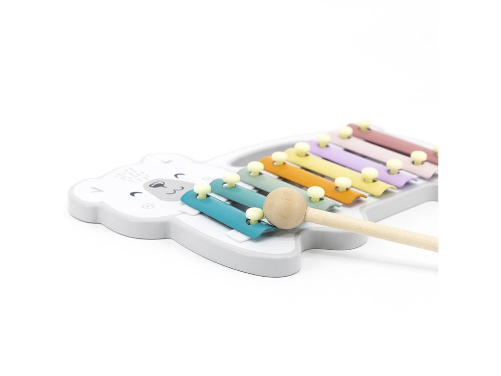 Medvedík pozýva všetky deti na lekciu hudby! Stačí len ľahko poklepať na kovové doštičky, aby sa ozvali krásne zvuky zvončekov.